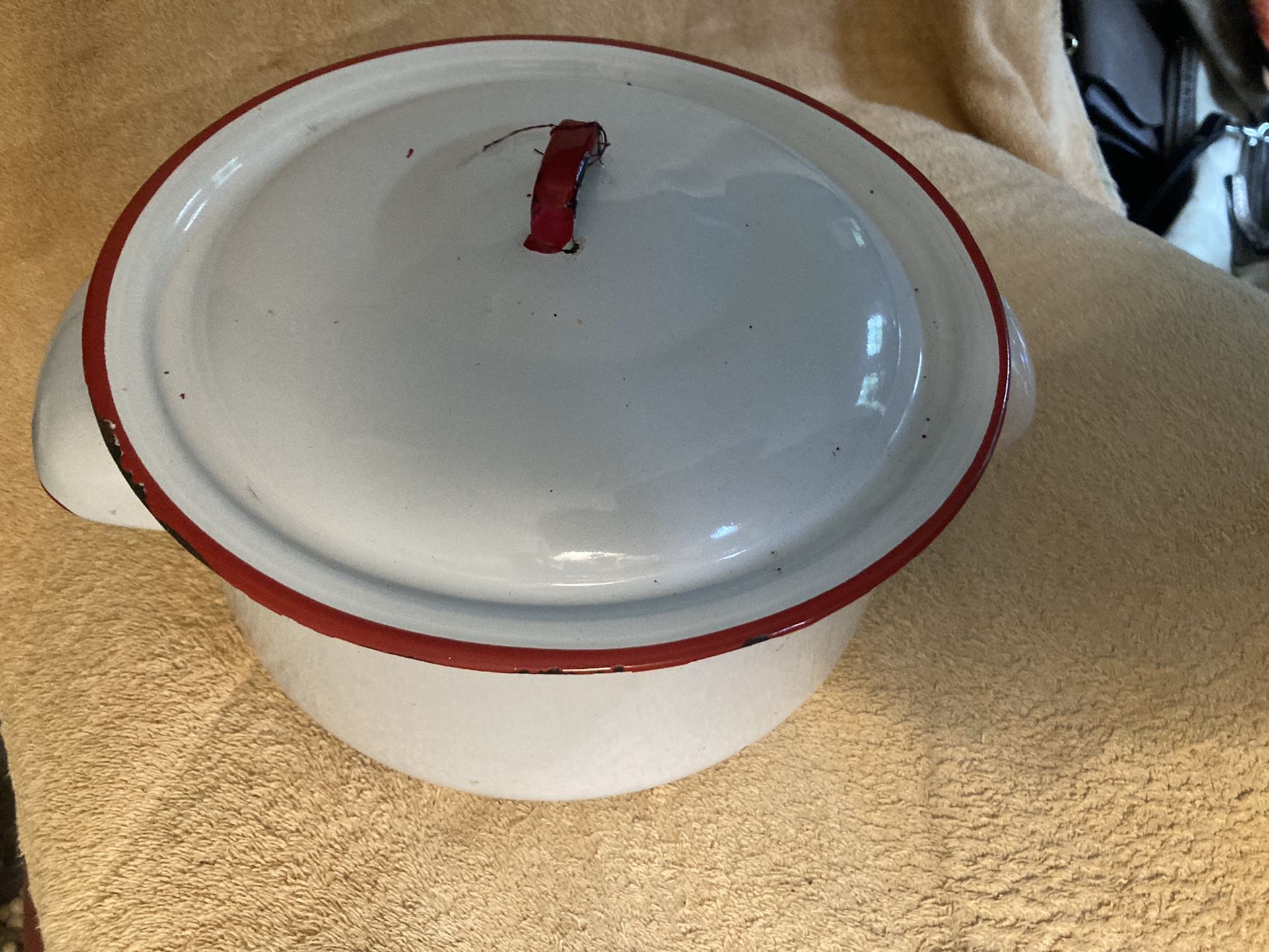 8.5” x 7” x 4.75” h white be/ red enamel has side & top handles has a few places where the enamel has worn off from use red trim great for a country farmhouse look
