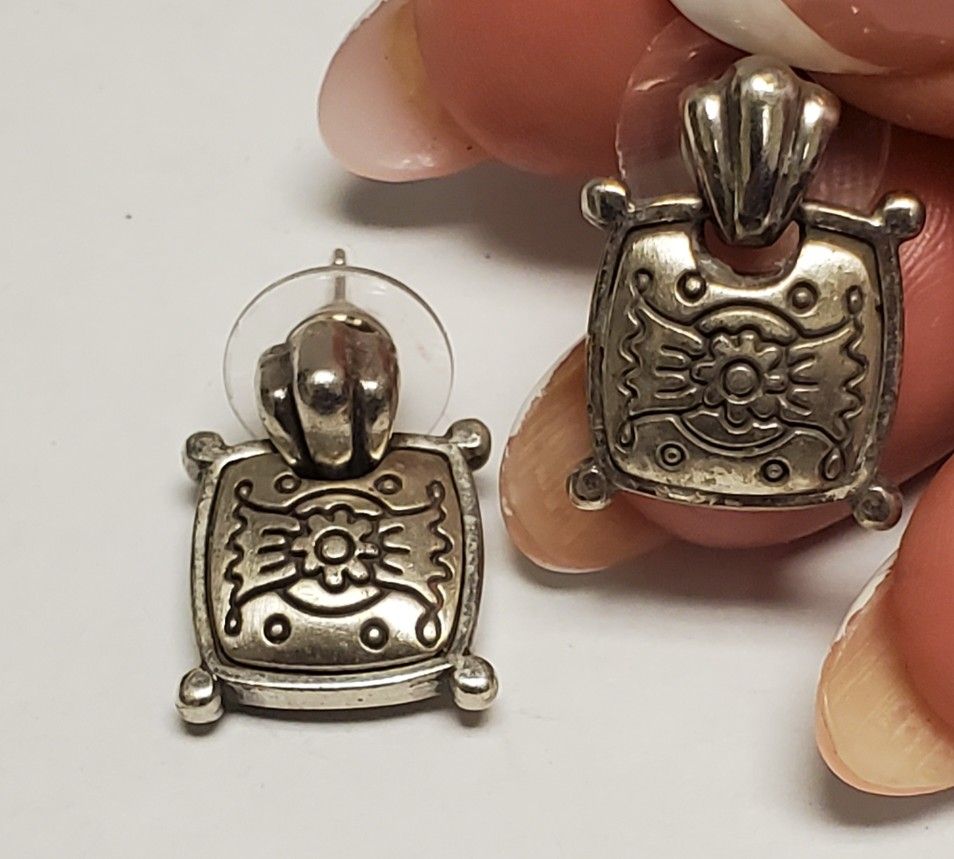 These vintage Brighton square post earrings are the perfect addition to any jewelry collection. With a secure lock back closure, they are safe and comfortable to wear for any occasion. The silver color and dangle/drop style make them a versatile accessory that can be dressed up or down. The earrings feature no stones, making them a great option for those who prefer simple and elegant jewelry. They are crafted from an unknown metal and have no stones, making them a unique and timeless piece. These earrings are a must-have for any fashion-forward woman who loves vintage and antique jewelry.