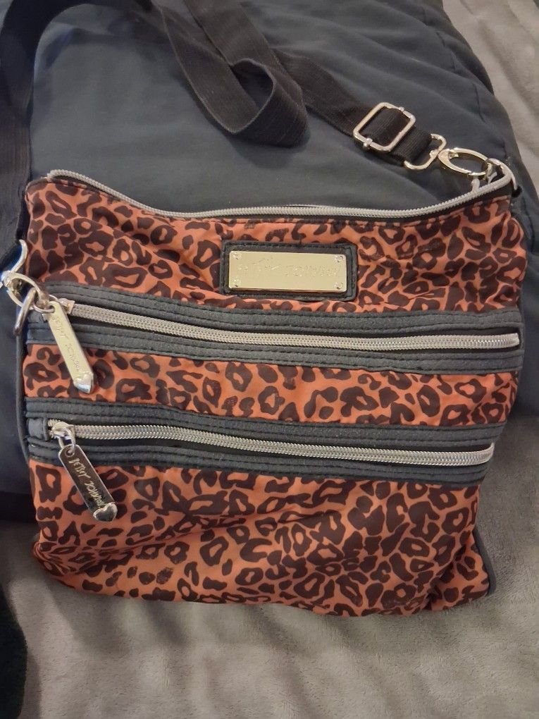 betsy johnson purse leopard crossbody Gently used Mint condition Cute heart accents on zipper pulls 2 front zippered pockets 1 interior zipper pocket 3 interior pockets 10.5x11x22