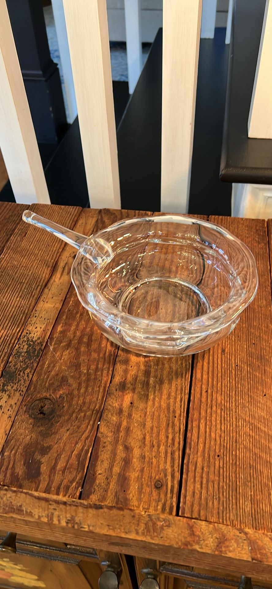 Investigated this, appears to be a vintage Hand Blown Glass Snack Server Skillet. Although it looks like cookware (double boiler piece) these were made for serving food/snacks and were manufactured open (they did not come with a lid). They were popular in the 1950s and used for entertaining guest, but were not made for a very long time. Generally speaking, most were likely discontinued by the 1960s. It is about 7” in diameter and 3” tall with a 4” handle. Excellent vintage condition as pictured. Thanks for looking, click my name to see my other listings