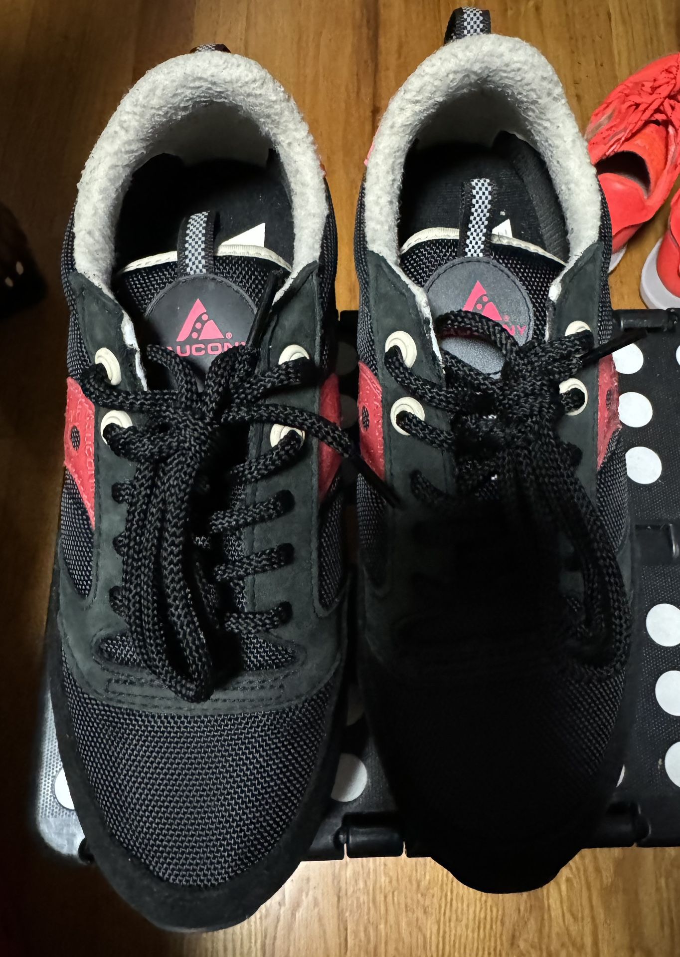 Gently used men’s Saucony size6.5 youth 6.5 or women size 8 no tears color black with red. Red looks a little pinkish. See photos gray on the inside.