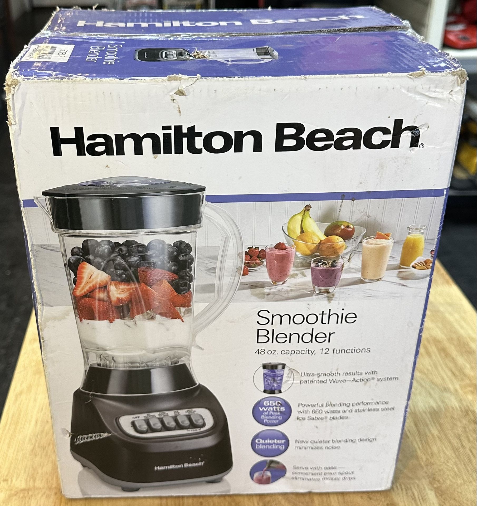 - New, sealed - Hamilton 50180F Beach Smoothie Blender - - Wave~Action - 12 functions - Quieter blending design - Pour spout - Easy to clean - BPA-free 48 oz. jar - FL/B/D16-I44-3730-AJ