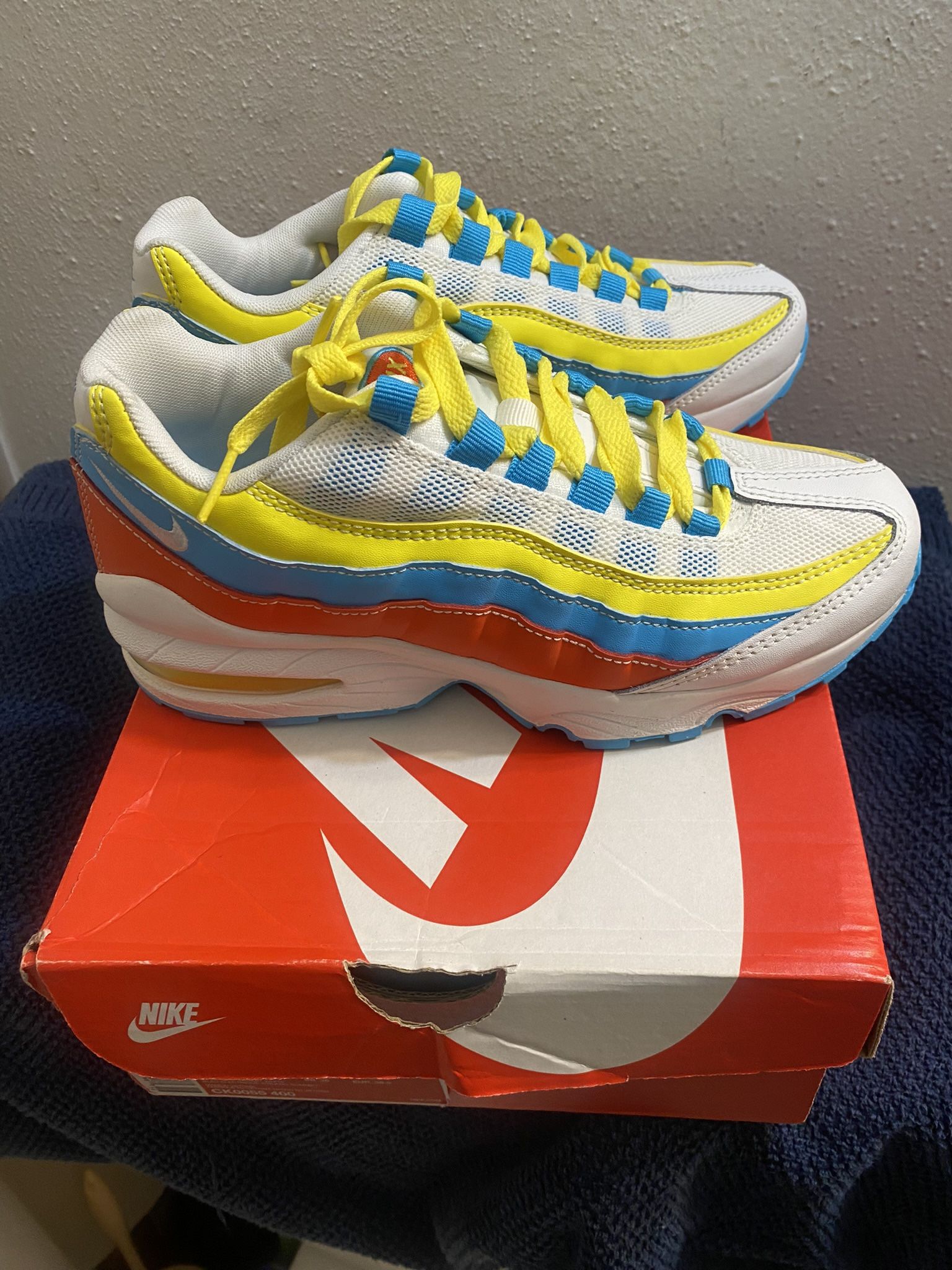 Nike Air Max 95 'White Blue Fury Opti Yellow' new, size 4.5 Y 6 women. $50 firm Pick up only, no low ballers,public meet