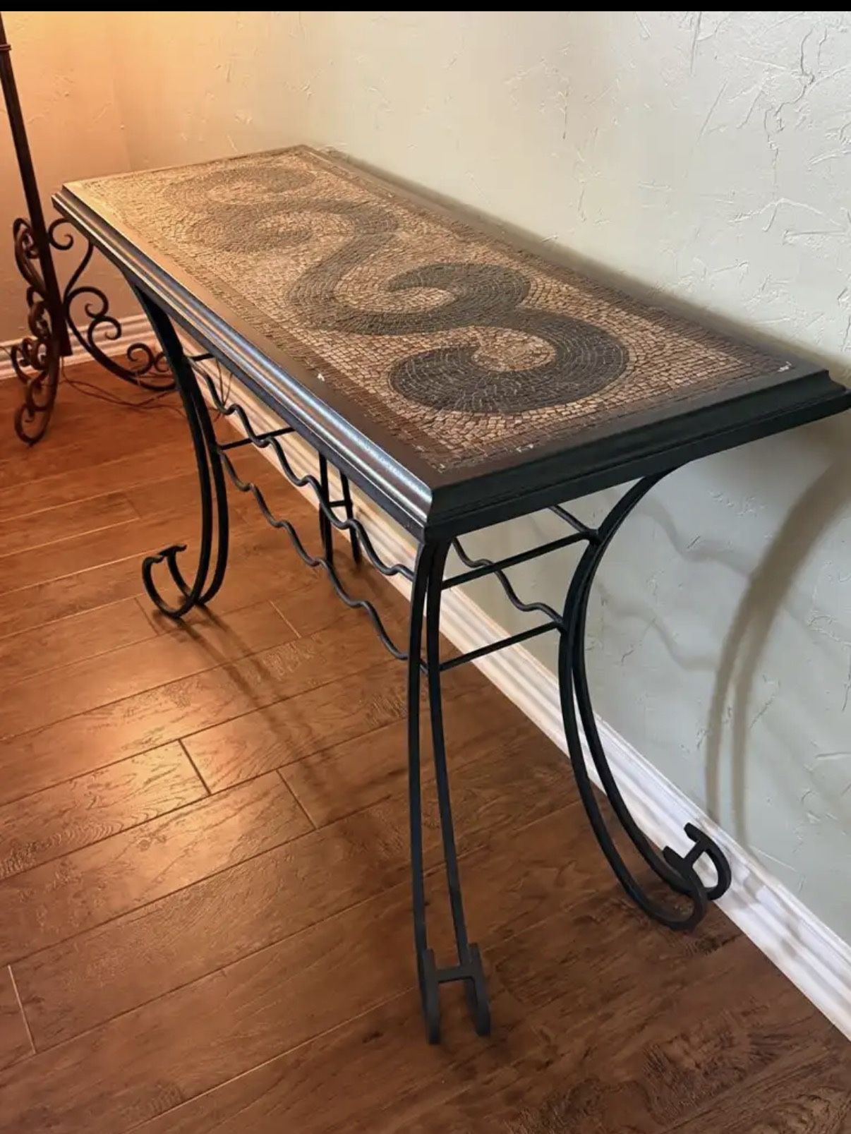 This is a sturdy table with iron wine rack below, mosaic table. It is part of a set from Pier 1. Can be used indoors or outdoors. Dimensions: 48L × 17W x 30Н. Porch pick up Grand Prairie tx 75054