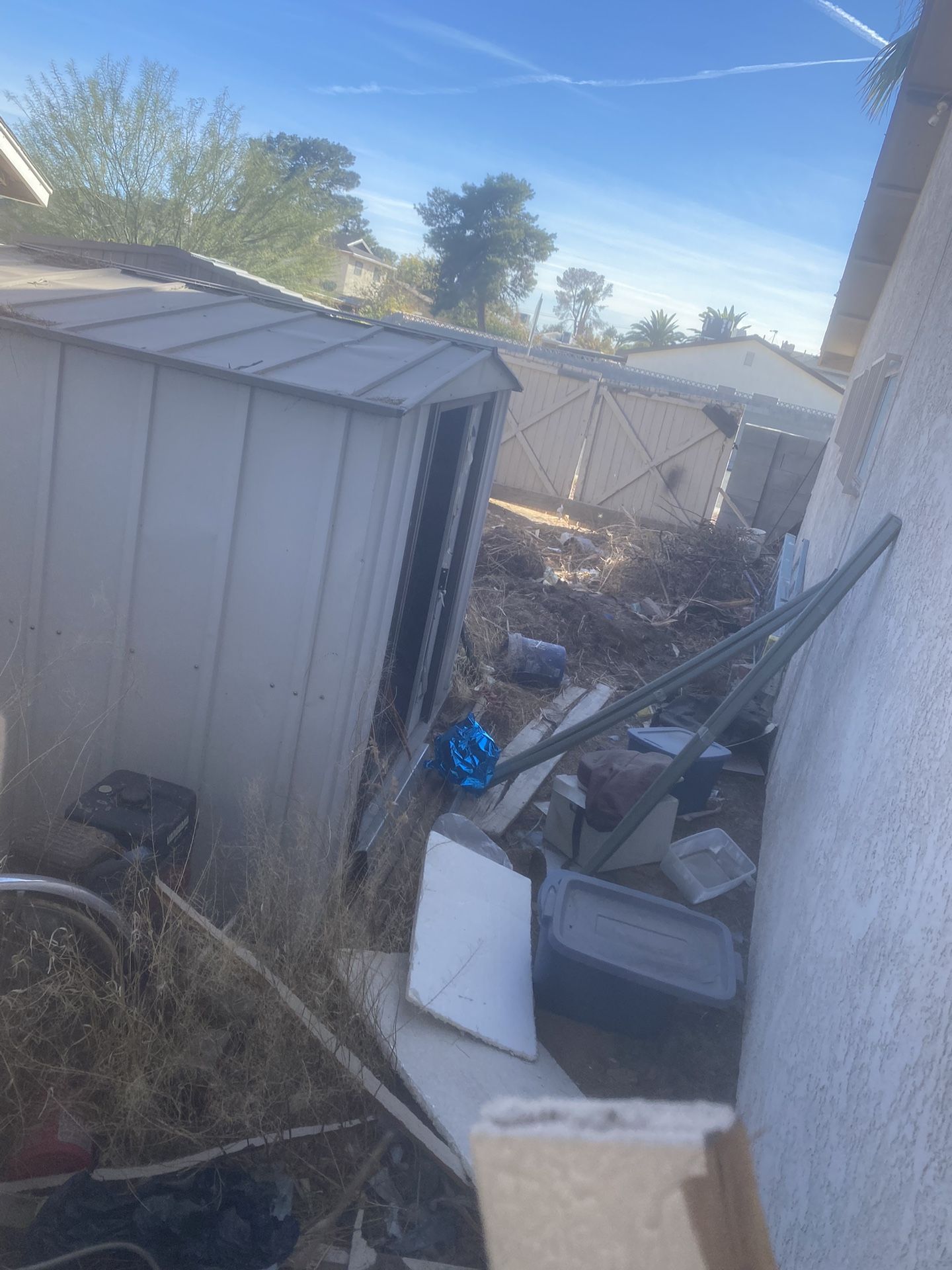 Shed is a good size free to good home but you gotta haul the junk you see too. Not the weeds just the crap
