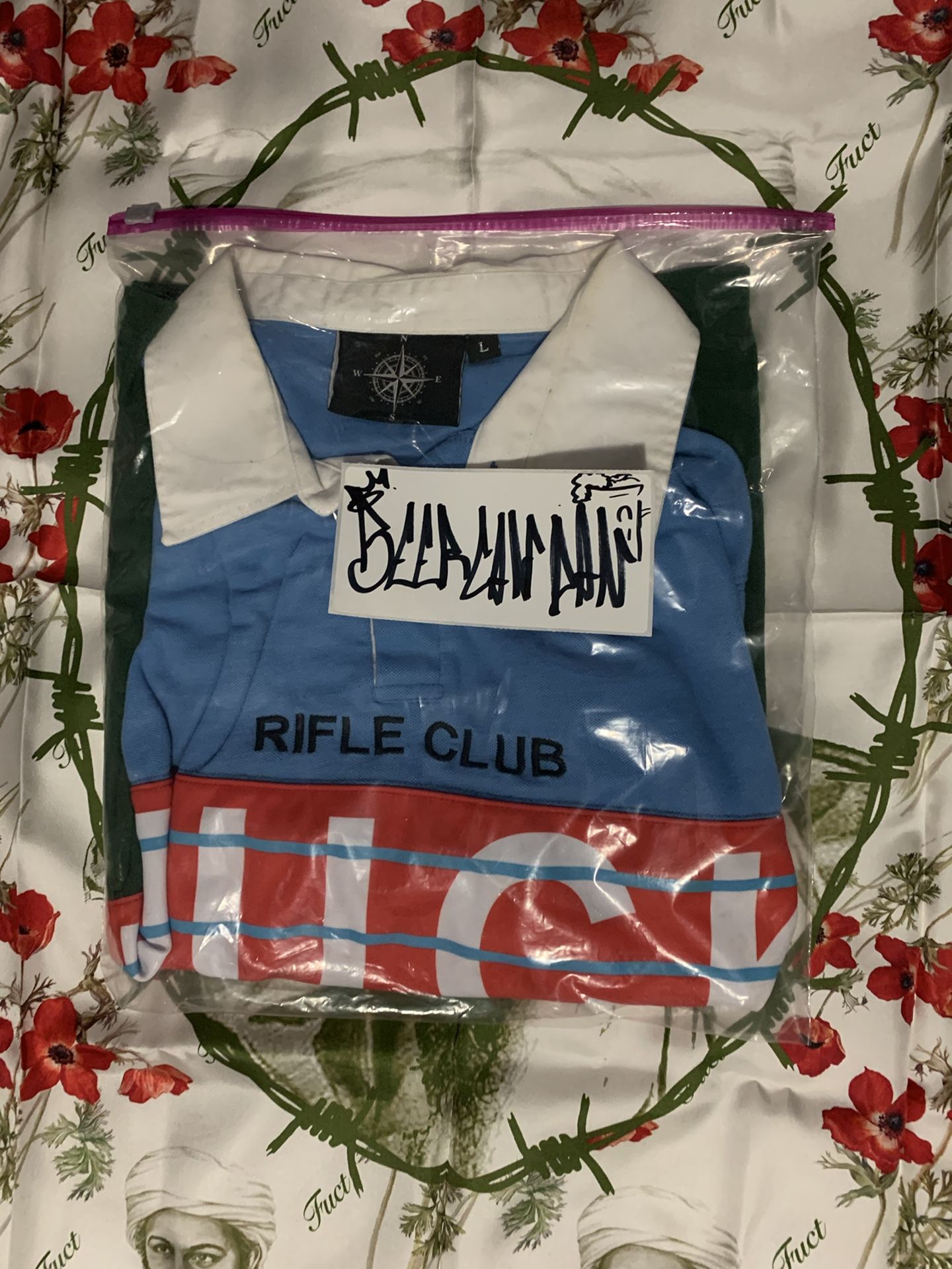 Compass Rifle Club Polo Crew Neck (needs attention) Large Blue/Green Retail bought Used for 2hrs then bagged it cause it was to big Going to be hard to let go but best offer wins Thank UU for looking