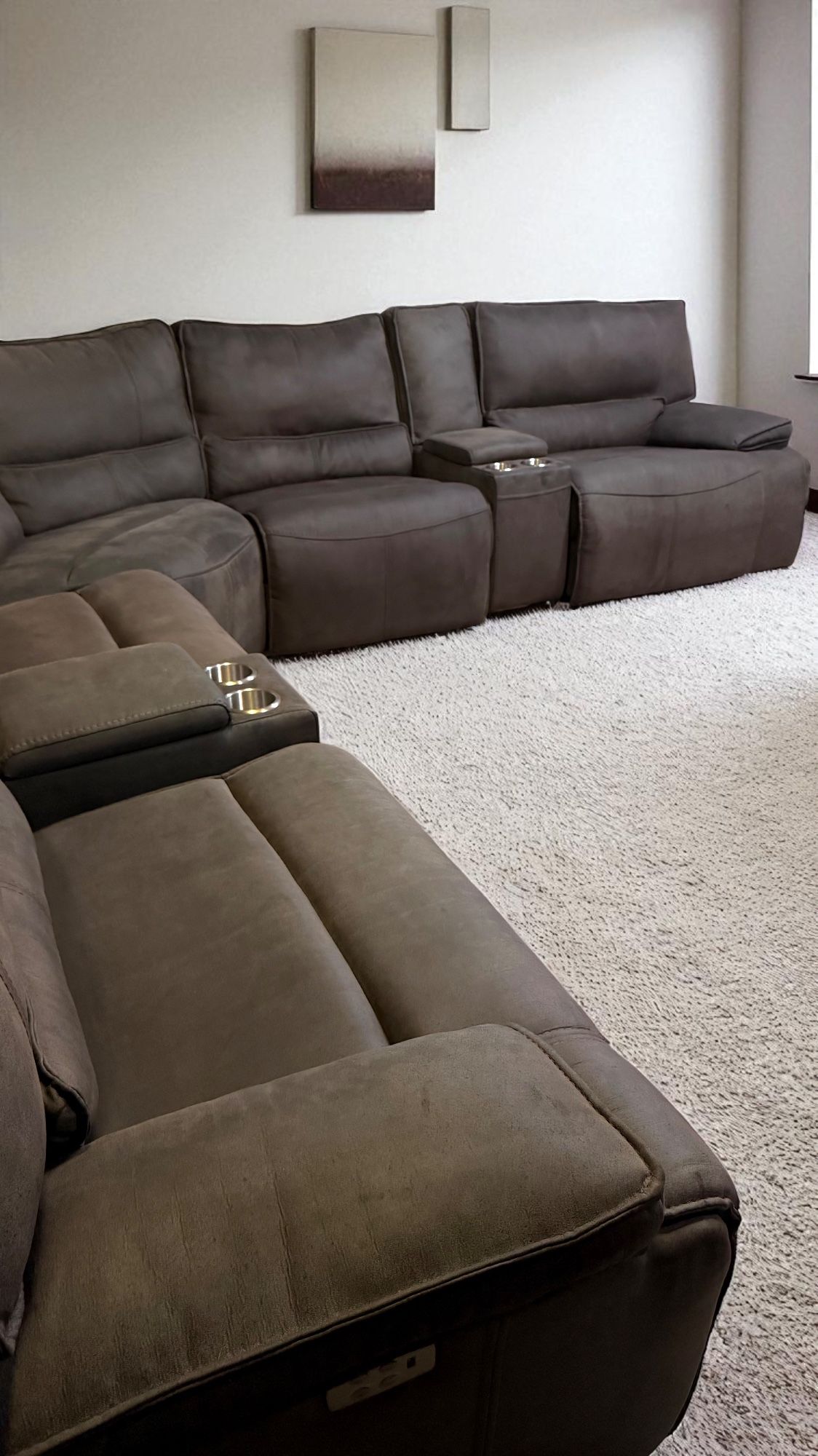 Dark Brown Brower 7pc Power Recliner Sectional Sofa. Four Power Recliners with Power Headrests & Footrests. Four Stainless Steel Cupholders. Two Storage Compartments with USB Charging. Comfortable Design. Excellent Condition. Material Cleans Easily. $2,500 Retail Value. Pickup in 92139 or Delivery Also Available. Dimensions: 140in Wide, 140in Long, 39in Tall.