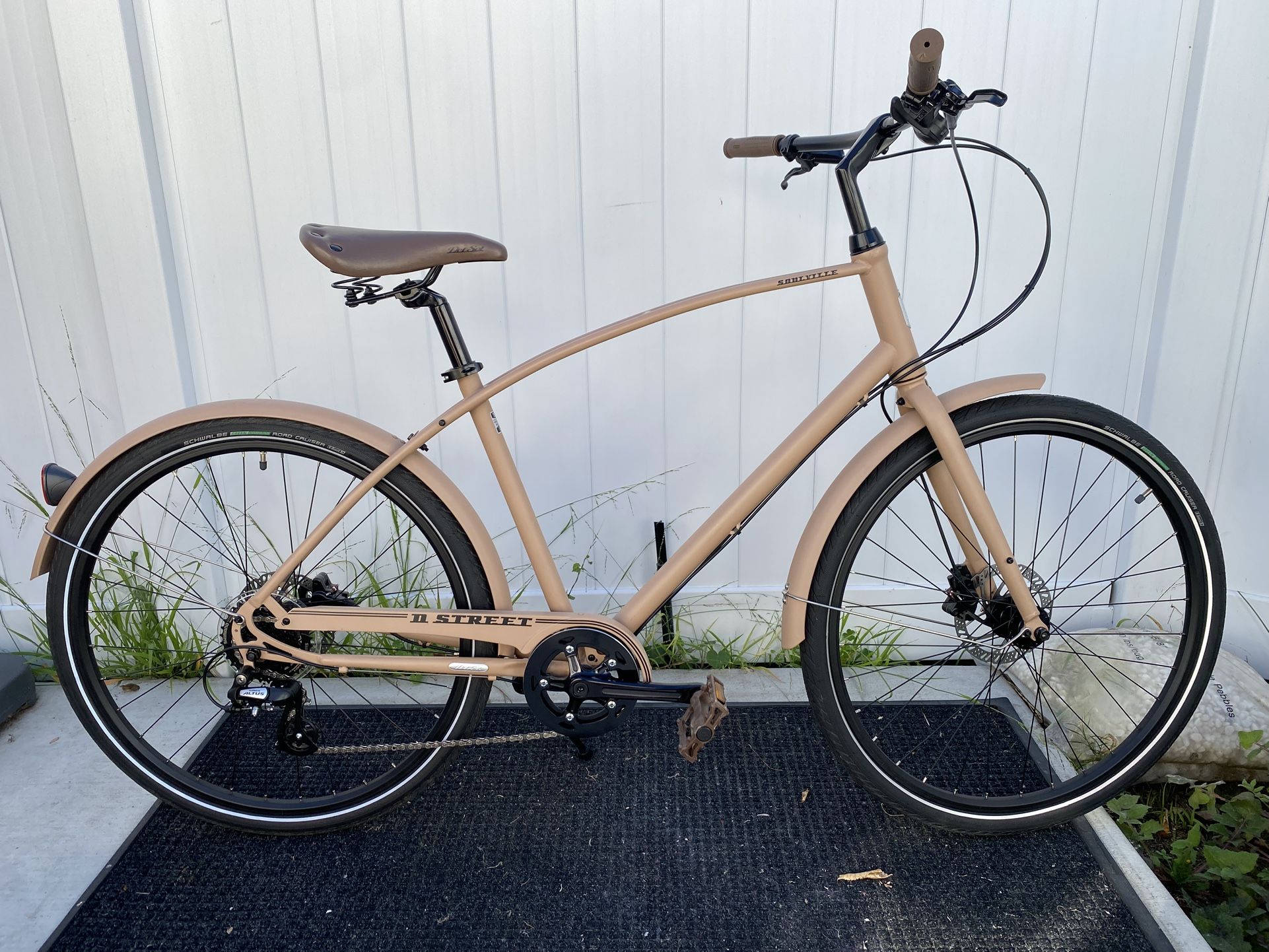 Like new condition. Got it for my son but it was never ridden. Small insignificant ding on the seat tube from storing with other bikes in the bike room. 19” Size Large frame. Riders 5’9”-6’2”. 650B disc brake wheels. Schwalbe Green Compound road cruiser 650x44 tires Shimano ULink brake levers Shimano Altus RD-M310 rear derailleur Shimano Altus Rapidfire Plus 8-speed | Optical gear display Tags: Schwinn, beach cruiser, commuter, townie, bmx, 650b