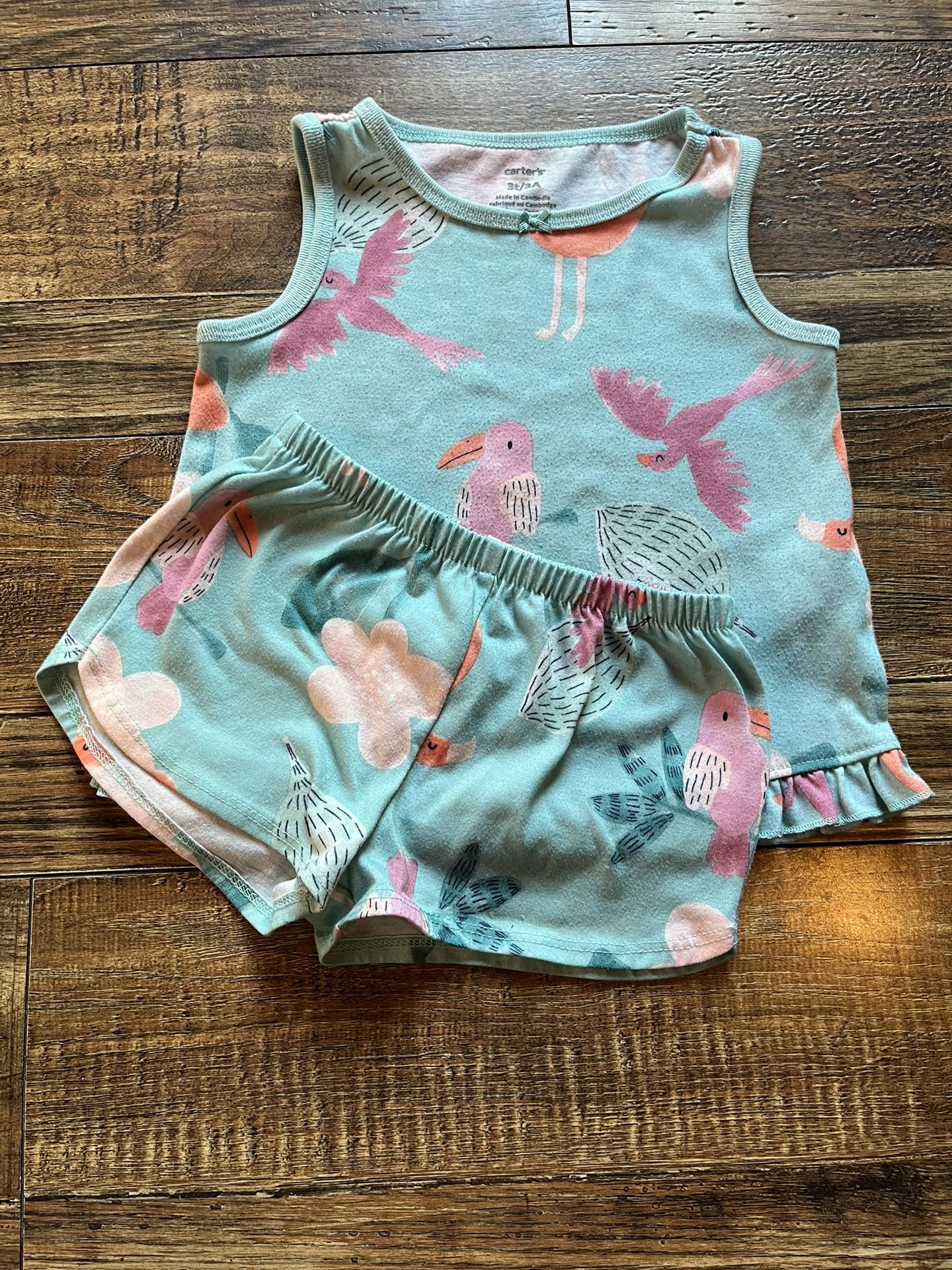 Adorable tank and shorts set with a colorful bird print. Features shades of teal, pink, and orange