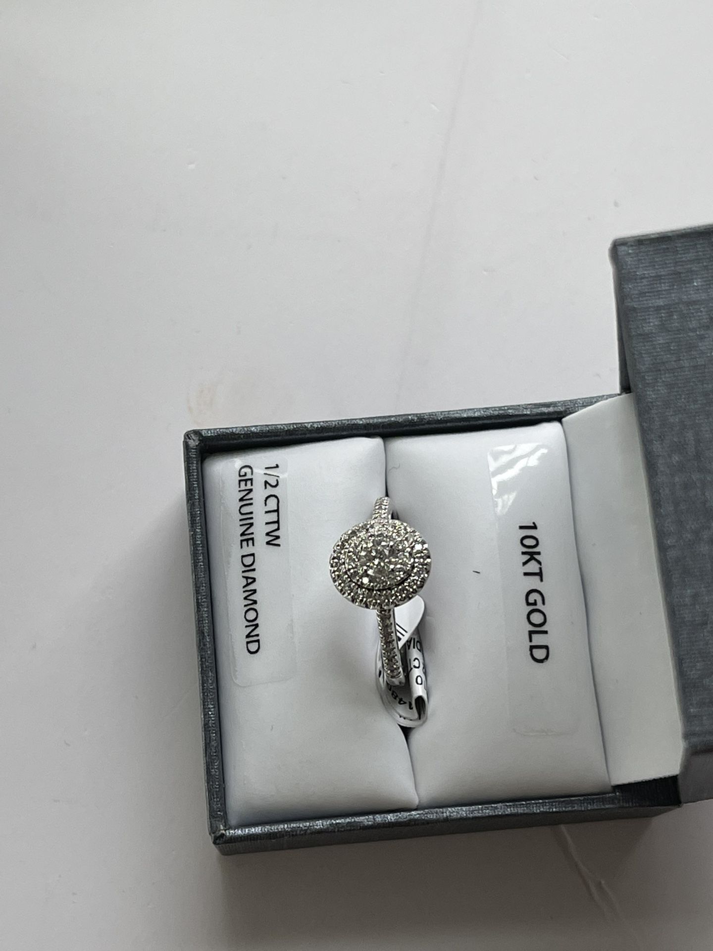 New with tag 10KT WG 1/2 CTTW OVAL HALO DIA ENG RING