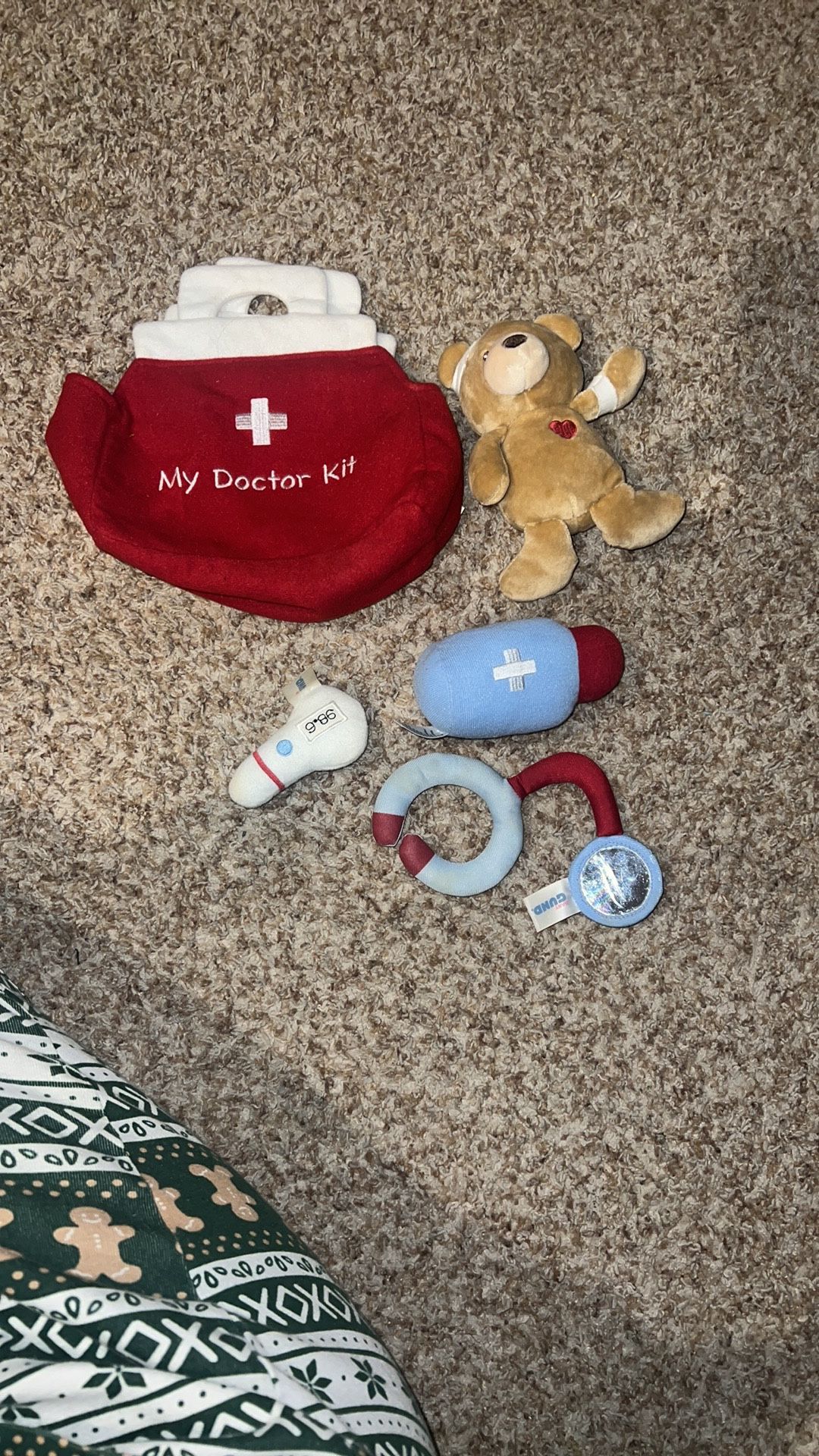 My First Doctors Kit Playset baby gund. Has stains from play. Hasn’t been pretreated or washed so they may come out. I think bear used to make sounds but it doesn’t anymore