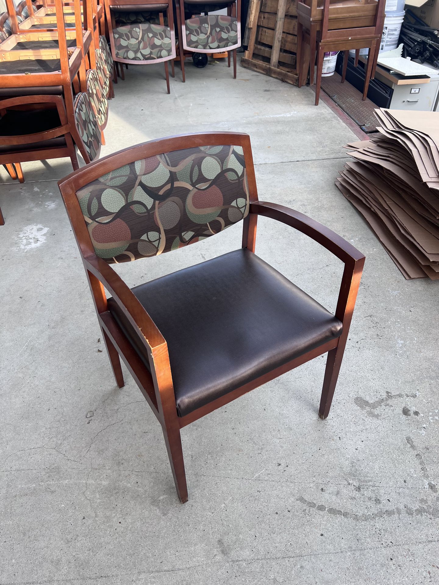 Great chairs for any type of lobby in good condition. Wood framed and a vinyl seat for easy wipe down. 8 - one seater $15 each 6 - two seater $25 each 6 - three seater $35 each