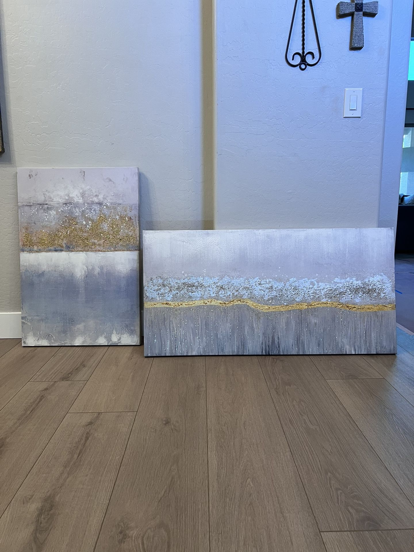 TWO DIFFERENT LARGE Blue/Grey & Silver/Gold Foil/Glitter Textured Canvas Wall Art Perfect condition large canvas wall Art, Artwork, wall decor! I have so many wall pictures for sale. Textured Canvas Wall Art, Wall Decor Artwork. Framed wall art, GLAM artwork, wall decor, wall art, wall picture, framed art. In perfect condition. 24x36 piece of artwork for $40 48x24 piece of artwork for $70 Will sell both together for $100! I’m selling multiple household items, furniture and home decor. Check out my other listings! The more you buy, the more you save!!