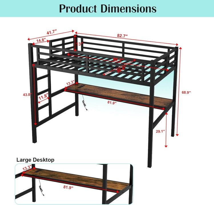 1. [Loft Bed with Desk for Space-Saving]: Maximize your room's vertical space and create a clutter-free environment. This high loft bed with a spacious desk allows you to create a perfect workstation for studying, gaming, or working. The clever design frees up significant floor space, making your room feel more open and organized. 2. [Sturdy & Noise-Free Metal Frame with Anti-Tipping Anchor]: Crafted from a heavy-duty, reinforced metal frame, this loft bed provides a stable and quiet sleeping experience. Its robust, noise-free construction ensures long-lasting durability, supporting up to 350 lbs. For an added layer of safety, a simple-to-install anti-tipping anchor is included to secure the bed to the wall, ensuring maximum stability and tip-over prevention for a worry-free sleep. 3. [Built-in USB Charging & Smart LED Lights]: Modern convenience is at your fingertips. The integrated USB charging station on the desktop allows for easy access to charge all your devices. 4. [Full-Length Safety Guardrails]: Safety is our top priority. This metal loft bed is equipped with full-length guardrails on all four sides to prevent falls and provide a secure sleeping environment. The sturdy integrated ladder offers a safe and easy way to climb up and down. 5. [Quick & Hassle-Free Assembly]: Setting up your new loft bed is simple and straightforward. With clear instructions, all parts are labeled, and tools are included, the assembly process is designed to be stress-free. For the easiest and quickest setup, we recommend two people for assembly. Enjoy your functional and stylish bed in no time