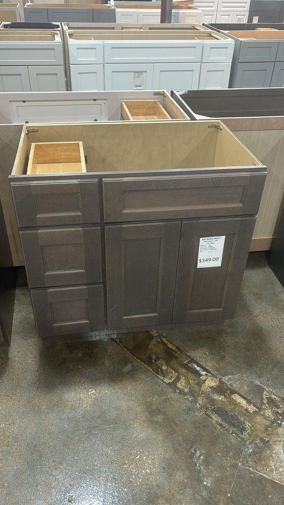 BATHROOM VANITY 36" Wide Drawers: Left Vanity Type: Cabinet Box Construction: Plywood Price: $349