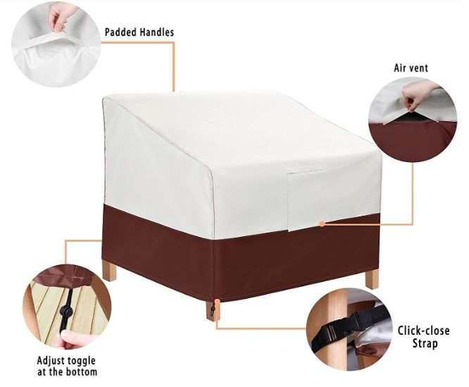 BRAND NEW See dimensions in last image. ** 1 for $29 ** 2 for $56 ** Tired of wasting your time on covers even more fragile than your cushions? Made from HEAVY-DUTY 100% Oxford Fabric, much thicker and sturdier. ** WITHSTAND 100% HARSH WEATHER CONDITIONS - Designed for all weather conditions, the patio furniture covers are coated with strong fabric layers, keeping your furniture good even in wild weather conditions. ** Elastic hem cords help hold the cover in place on windy days while the 4 chair straps keep everything incredibly snug. ** VENTILATING POCKET - Featuring breathable mesh pocket to keep your cushions dry and free from mold.