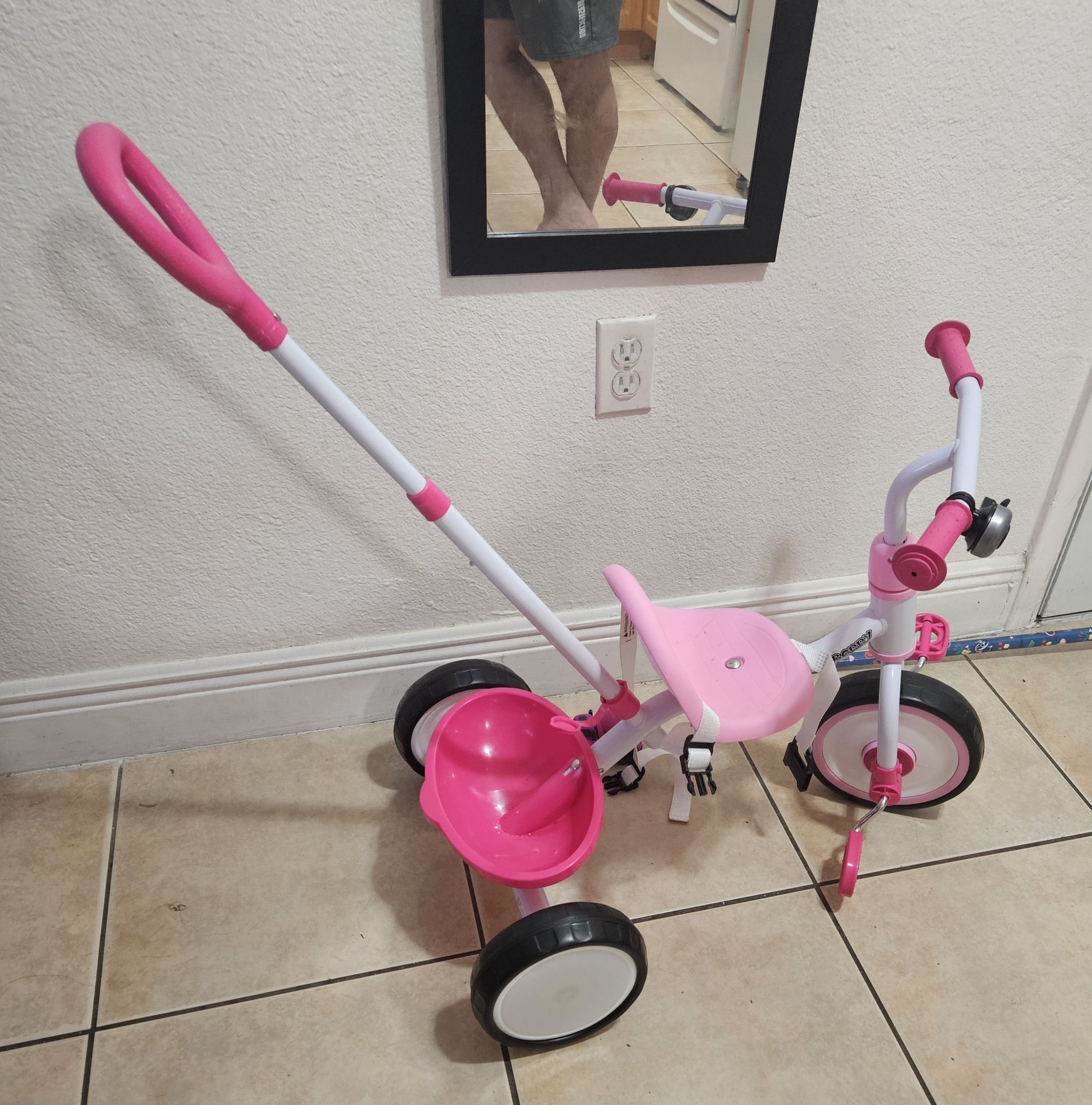 Esta totalmente nuevo mi niña nunca lo uso es 2 en 1 se le puede quitar el mango para q la niña ande sola el rango de edad es de 2 a 4 años