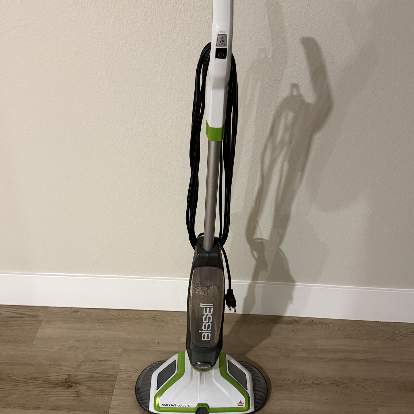 Brand: Bissell (SpinWave). • Type: Powered spin mop for sealed hard floors (tile, vinyl, wood). • Features: Dual rotating pads for effortless cleaning, on-demand spray trigger, and quiet operation. • Condition: Clean, looks great, and works perfectly. • Includes: Power cord and water tank.