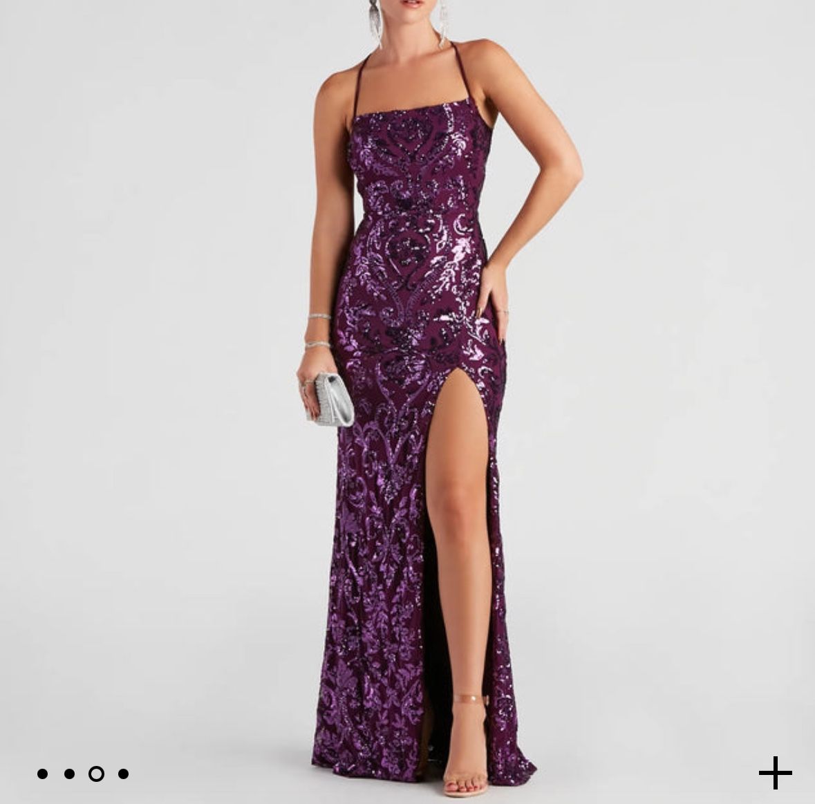 Sequin Mesh Formal Dress Size: S Eggplant color As is Worn a few hours Fit & Features Sleeveless square neckline, no-slip strip Padded bust, no bra required Spaghetti straps, open back, lace-up strappy design, tie closure High waist seam, lower back zipper, hook and eye closure Floor-length hem, fitted silhouette, high front slit Sheer mesh fabric, full knit lining, moderate stretch Sequin embroidery, scroll pattern Runs true to size #dress #formal #prom #party