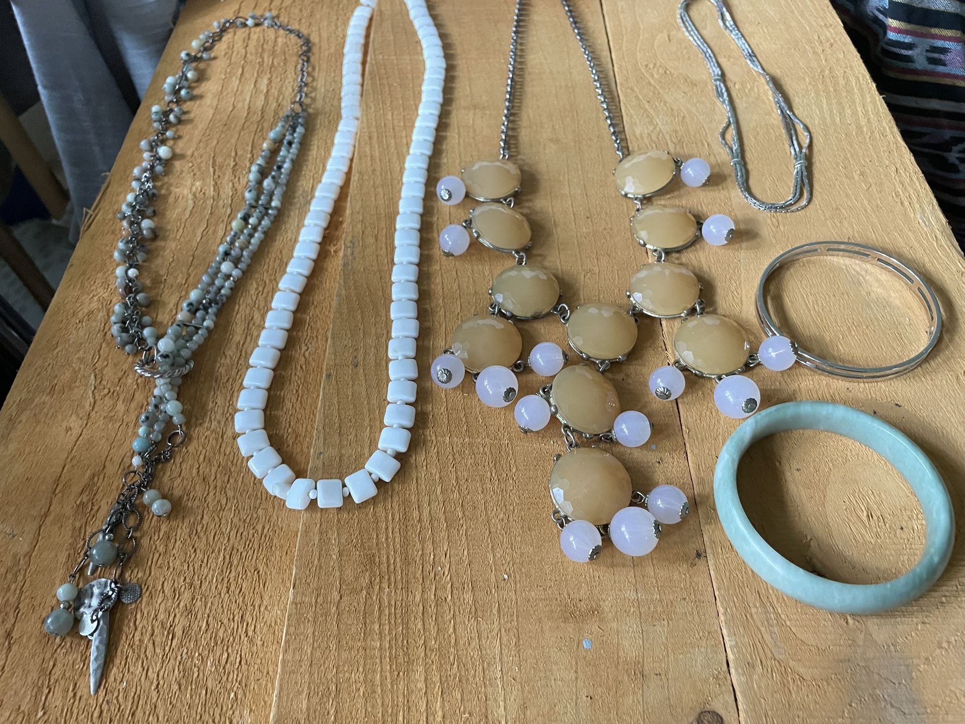 Necklaces, bangles, milk glass beads, natural semiprecious gemstone beads, faux jade