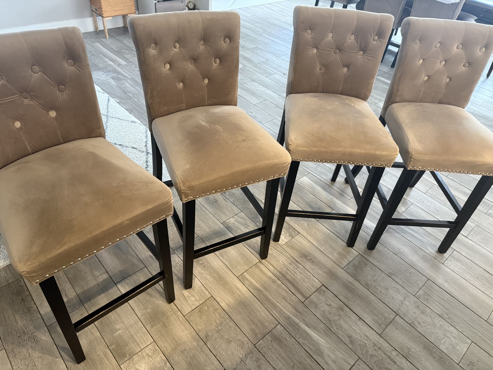 For sale are four tan and dark brown bar stools. They’re suede. They’re in good condition with some paint chipping on the legs.