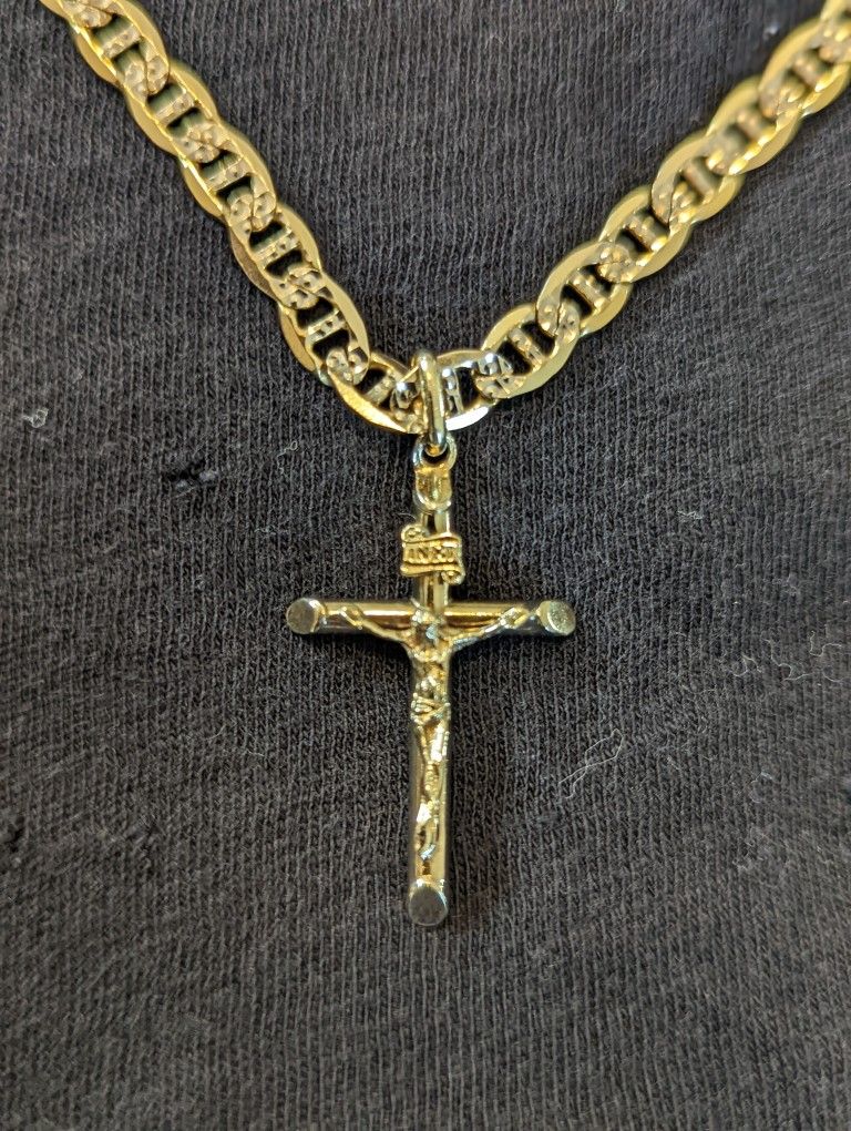 10kt Gold diamond cut mariner 5mm, 24inch chain/ w cross pendant.