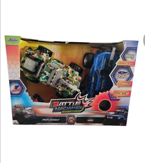 Jada Toys Battle Machines 1:16 Laser Combat RC Twin Pack *NEW IN BOX* This set includes two remote-control cars, "Iron Beast" (CAMO edition/Rare) and "Neo," designed for laser combat tag. The vehicles are equipped with lights and sensors for an interactive experience, and each car has a health meter to track hits during laser battles. They are ready to play out of the box and feature convenient USB charging for the Lithium-Ion batteries, providing up to 25 minutes of playtime per charge. The 2.4 GHz frequency allows for up to 16+ players to engage in battles within a 100-foot range. This product is suitable for children aged 6 years and older.