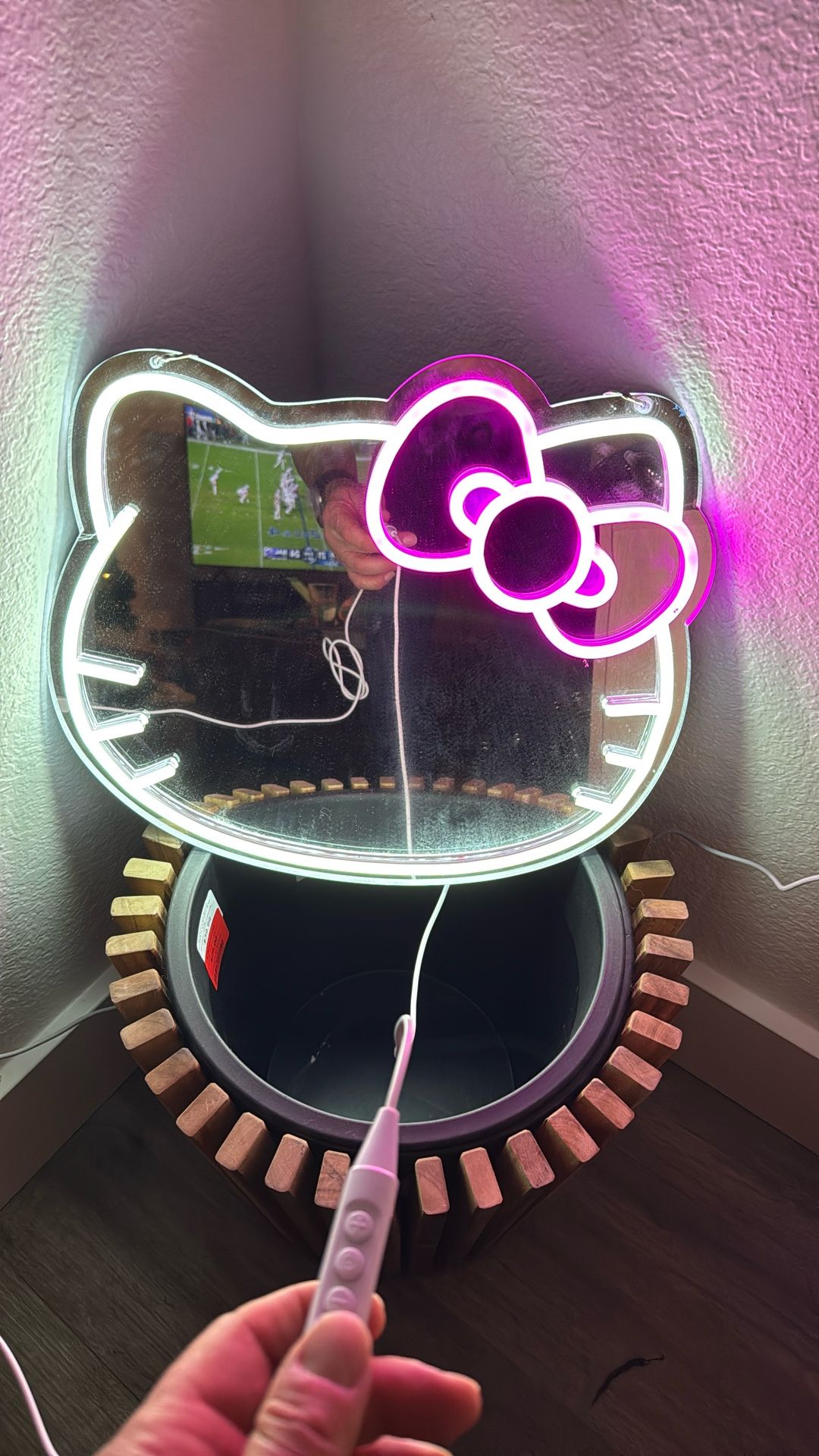 Hello kitty vanity-like mirror. Lights up. Great shape. Daughter has just grown out of all her hello kitty stuff. Roughly 16” x 13.5” Hangs by a chain.