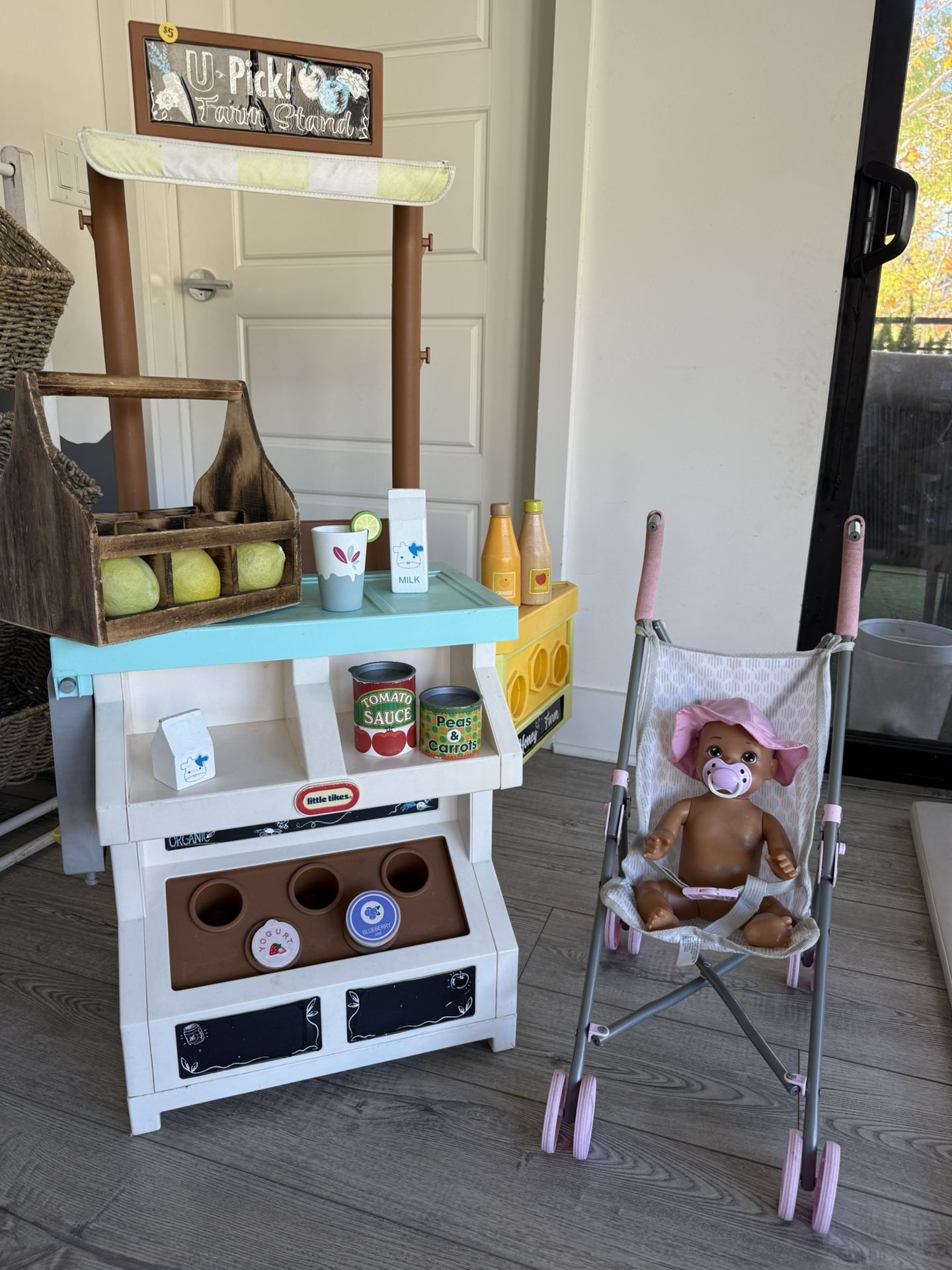 Little Tikes farm stand, stroller, and baby doll with accessories. *farm food toys not included