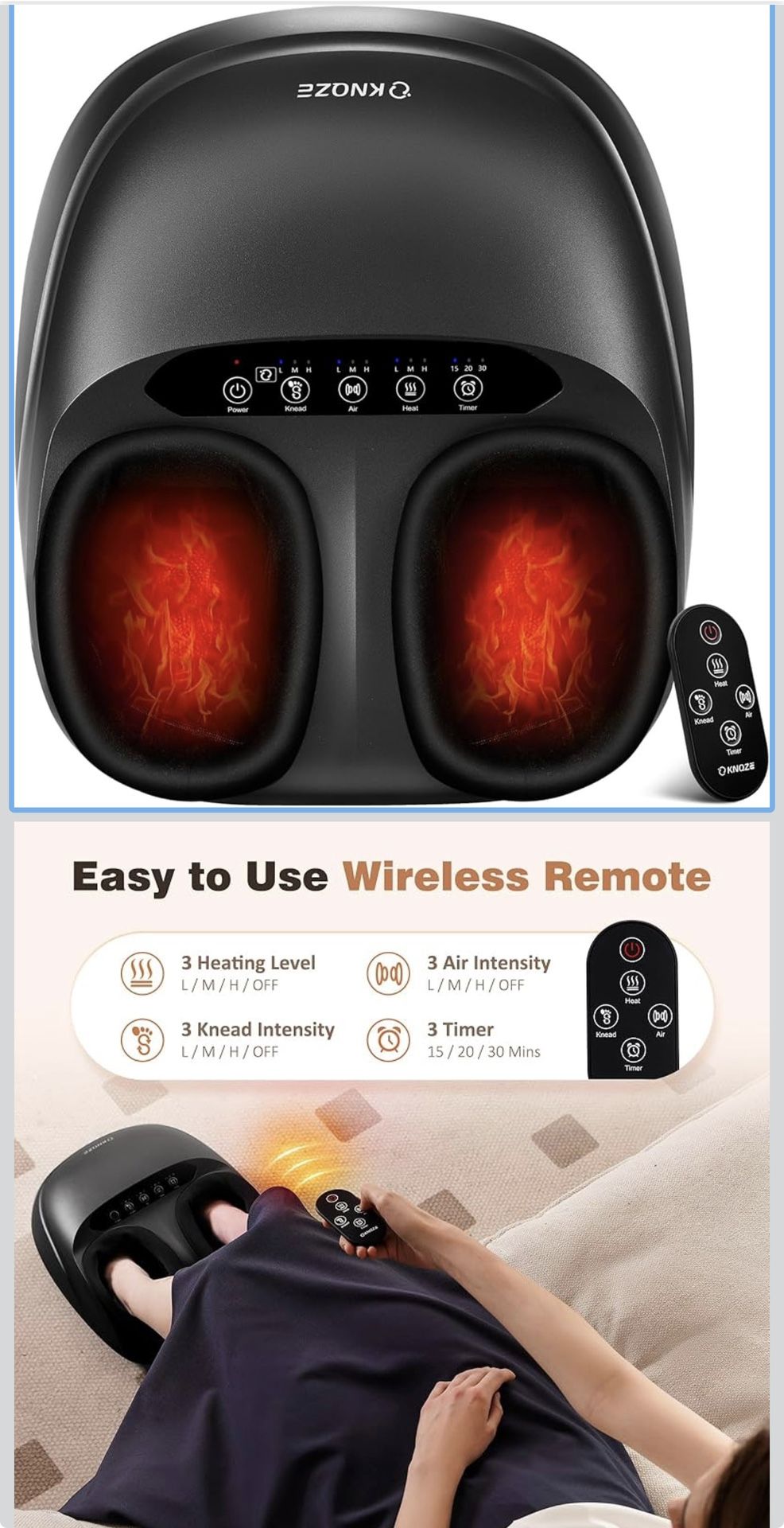 Disfruta de un masaje profesional para los pies】 El masajeador de pies con calor KNQZE sigue el diseño ergonómico, dirigido a las zonas de reflejo de los puntos de acupuntura en los pies, realizando un masaje de cobertura completa de 360° en las plantas, talones y empeines de los pies. Se adapta a pies de hombres hasta la talla 13 (EE. UU). 【Calentamiento Rápido y Función de Temporización】 3 niveles de calefacción (Baja-113°F, Media-122°F, Alta-131°F) y 3 niveles de tiempo (15/20/30 minutos) con función de apagado automático. La temperatura de calentamiento y el tiempo de masaje se pueden ajustar de acuerdo con las preferencias personales, y personalizar para satisfacer las necesidades de masaje de pies de diferentes personas. 【3 intensidades de amasado y aire】La máquina de masaje de pies imita la técnica de masajistas profesionales para realizar un amasado y masaje profundo en los pies, aumentando la relajación de los pies mediante compresión de aire y aliviando los músculos tensos desde los dedos hasta los talones. 【Fácil de usar y limpiar】El control remoto inalámbrico puede controlar el masajeador de pies sin tener que agacharse. La máquina de masaje de pies es ligera y portátil (solamente 5.6 libras), lo que facilita moverla a cualquier lugar para su uso. Las fundas extraíbles permiten una fácil limpieza y garantizan la higiene de los pies. 【Ideas de regalo y garantía】Hecho de material impermeable ABS de alta calidad, simplemente límpialo con un paño húmedo si está sucio. El masajeador de pies Shiatsu de KNQZE es el mejor regalo para mujeres, hombres, papá, mamá o cualquier amante. El masajeador KNQZE