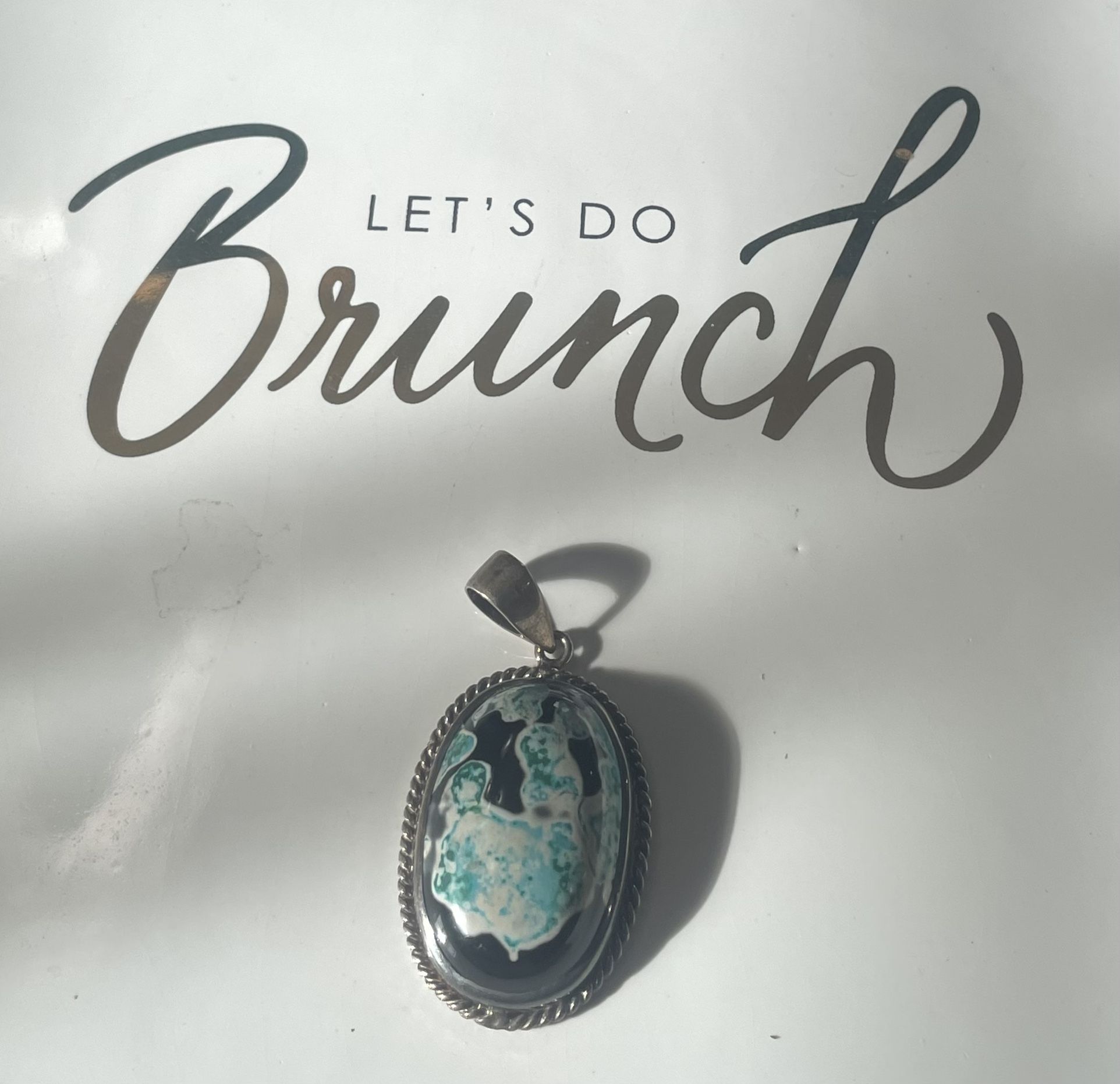 An oval silver shattuckaite pendant. A mix of turquoise and/or ocean jasper in appearance. Price is $15. - - - - - - - Cash only. Pickup only. Located near the South Premium Outlet Mall on Las Vegas Blvd and Warm Springs Rd. Please message for serious inquiries of interest.