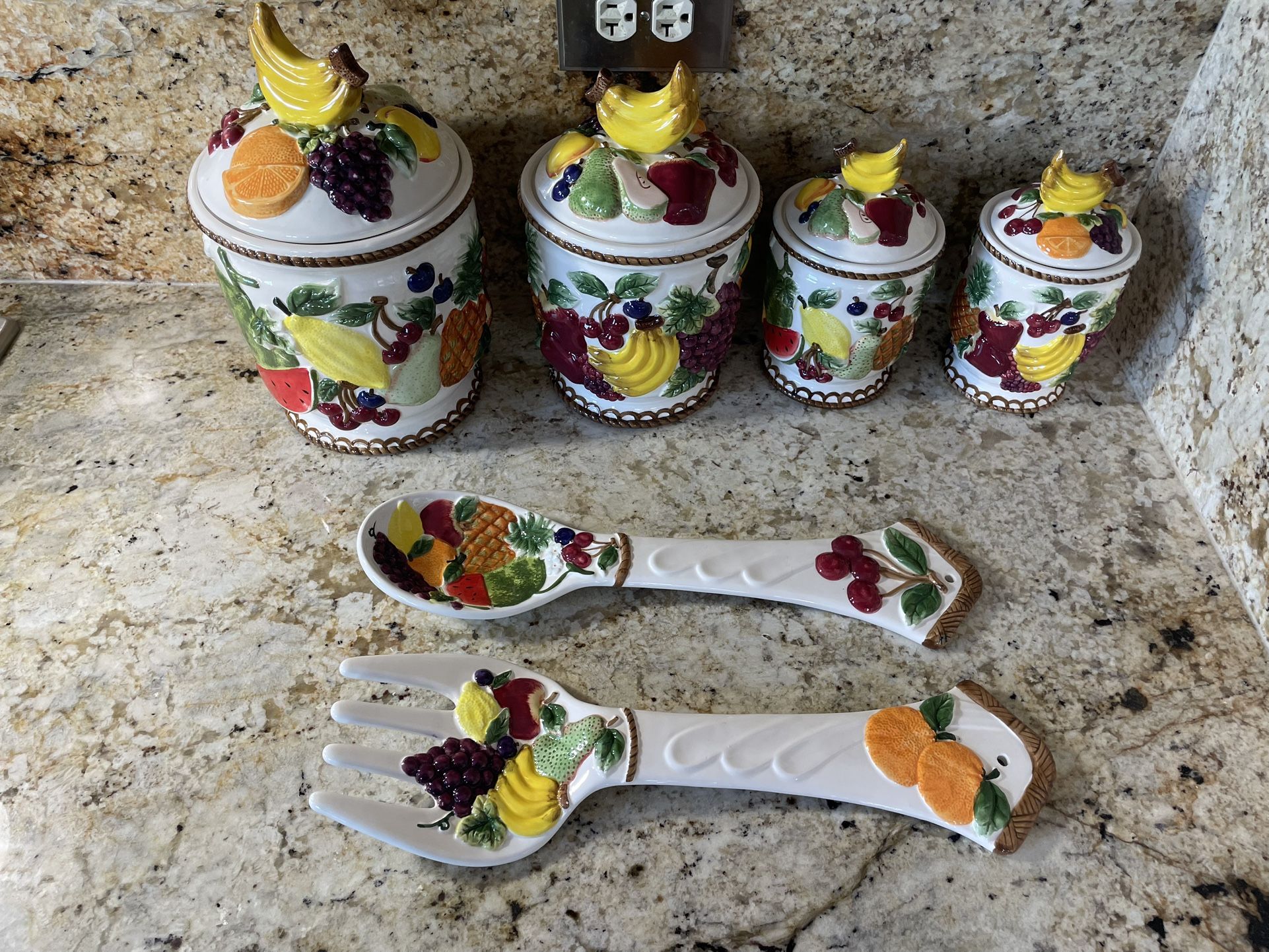 6pc Vintage KK Fruit Paradise Ceramicware-Storage Jars/Canisters + Display Fork & Spoon