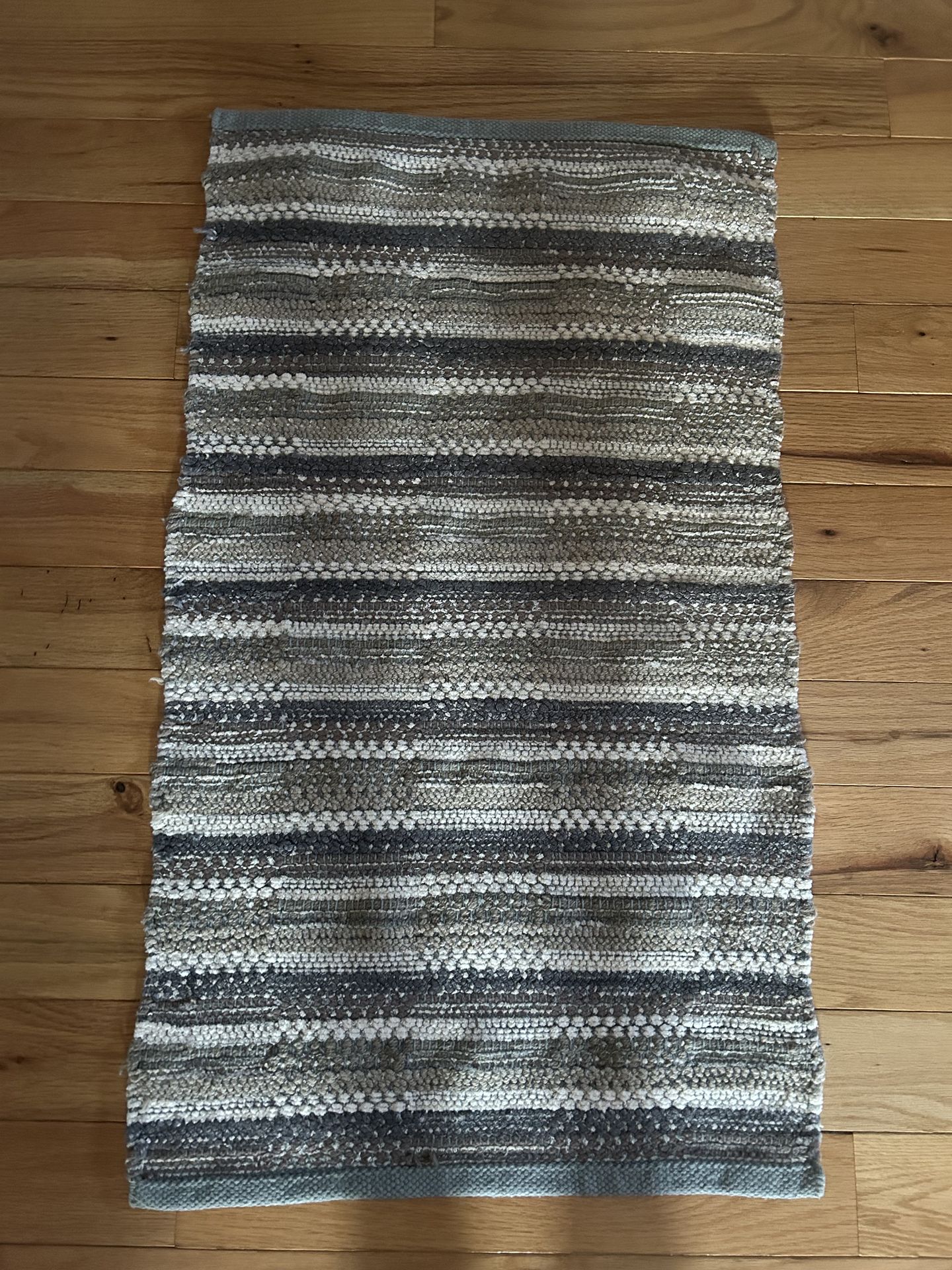 This is a woven throw rug with various shades of grey and white. It is roughly 34” x just shy of 20”. It is newly cleaned and from a smoke free and pet free home. Selling for $5.