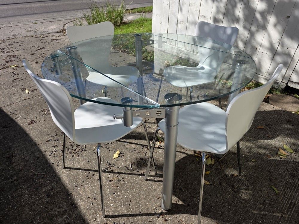 Selling a stylish, modern dining set that is perfect for small spaces! This table features a unique expandable glass top that can be collapsed into a more compact size for everyday use or opened up to accommodate four people comfortably. Features: Expandable Design: Tabletop collapses to save space when not in use. It is 29 11/16 in. x 47 11/16 inches when collapsed. It is 47 11/16 inches all around when expanded. Modern Aesthetic: Clear tempered glass top with sleek silver/chrome legs. Chairs Included: Includes 4 matching white molded chairs with chrome-style legs. Condition: Used. The chairs are in good shape; the glass tabletop has some visible scratches from normal use (reflected in the price). You will need a truck or SUV vehicle to haul