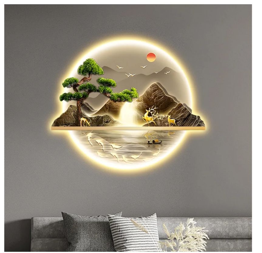 Zen Wall Art Decor with Led Light, Welcoming Pine Wall Decor Art, 3D Wall Sculpture Painting Decoration, Landscape Wall Sculptures for Living Room Bedroom Entrance (A, 60×72cm)