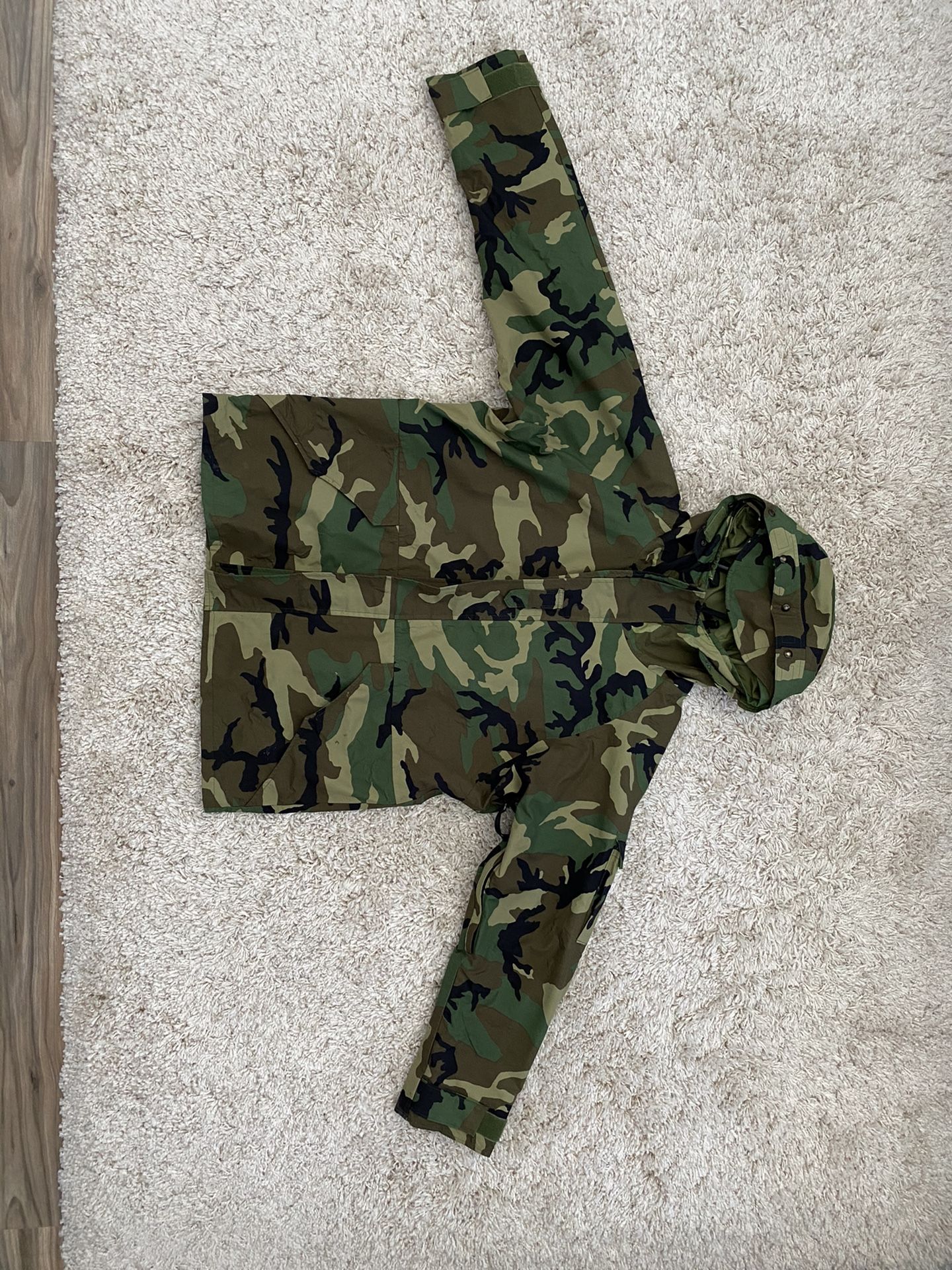Military grade cold weather parka. Camouflage in color. Size is a Large / regular. Excellent jacket for being outdoors in the elements breathable and yet waterproof.