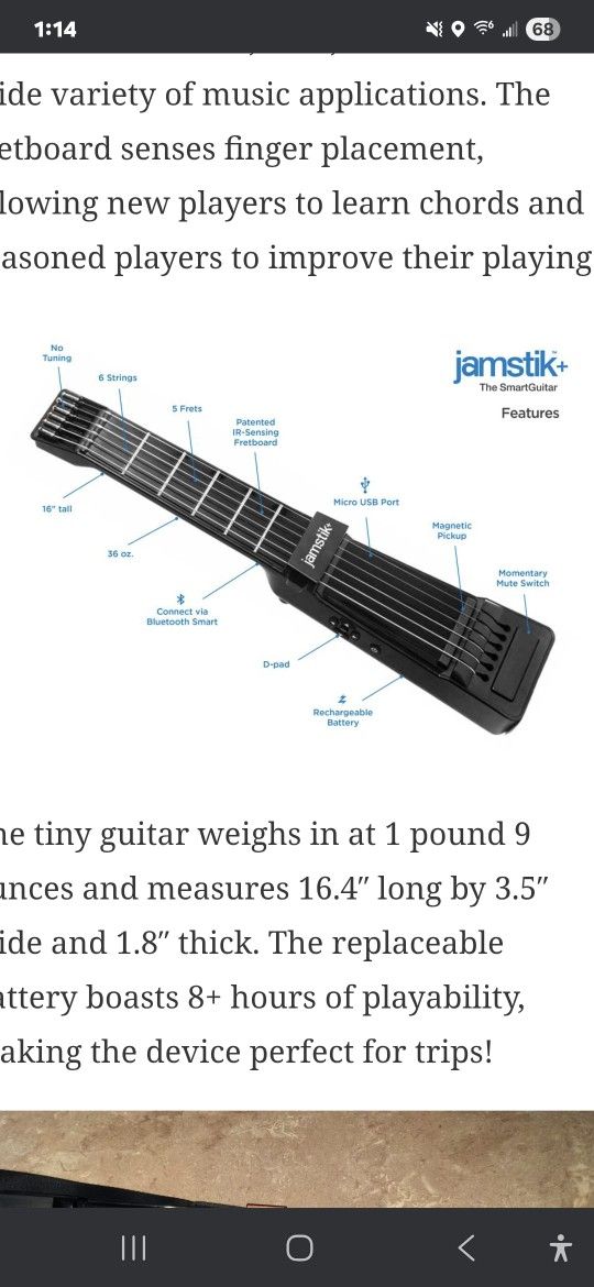 https://offerup.com/redirect/?o=aHR0cHM6Ly9nZWFyZGlhcnkuY29tLzIwMTUvMDkvMjMvamFtc3Rpay10aGUtc21hcnQtZ3VpdGFyLXJldmlldy9hbXAv Jamstik+ smart guitar in excellent condition. My kids got it as a gift a few years ago and never used it. I used it a few times. Download app from Google app store or Apple store and play directly from your phone. Teaches you how to play guitar. Cash only. Local pick up in south OC.