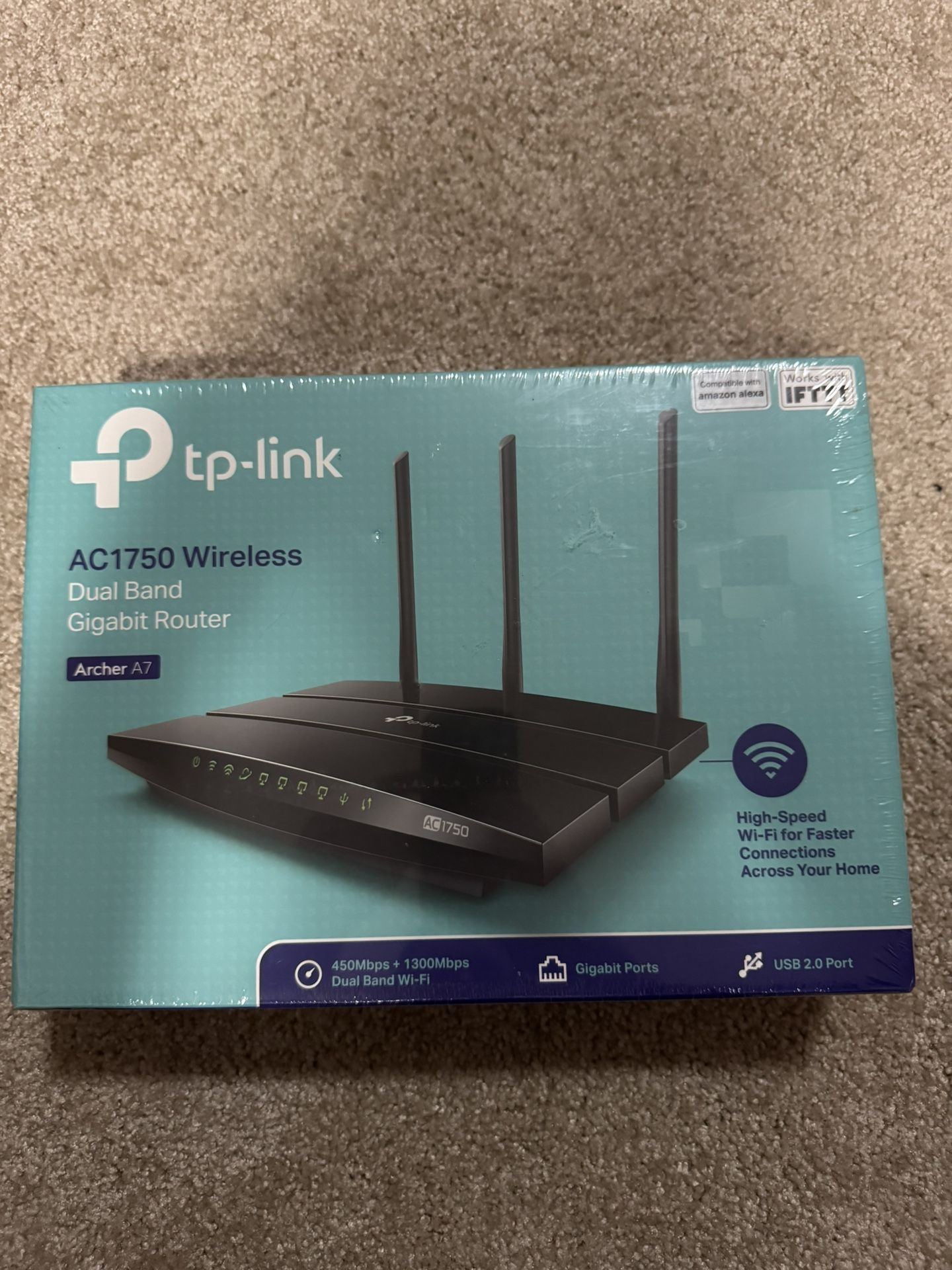 Brand new TP-Link Archer A7 AC1750 Dual Band Gigabit Router, still factory sealed. Features: • AC1750 Wi-Fi speeds (450 Mbps @ 2.4GHz + 1300 Mbps @ 5GHz) • Dual-band Wi-Fi for smoother streaming and gaming • 4× Gigabit LAN ports + 1× Gigabit WAN • USB 2.0 port for shared storage • Strong coverage with 3 external antennas • Easy setup via TP-Link Tether app • Works with Alexa Great option for home networks, apartments, or upgrading an older router.