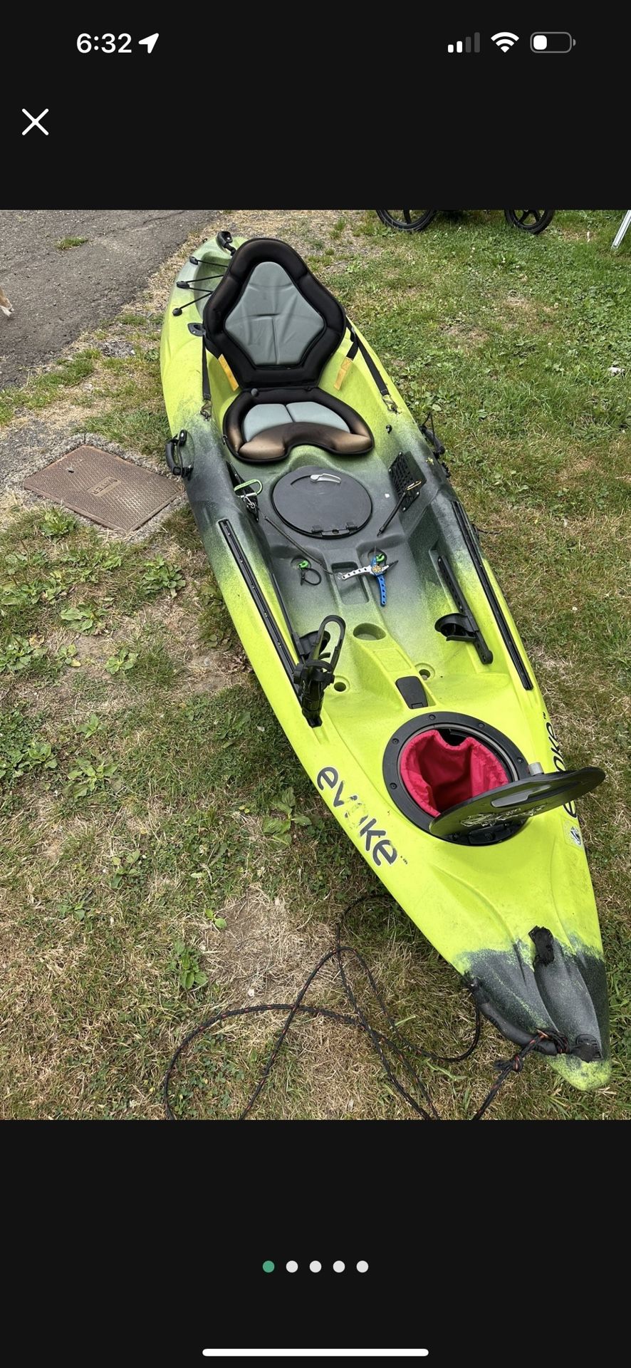 10 ft fishing kayak evoke originally 800$ added anchor trolly fishing pole holder for rails. Nothing wrong with it just don’t use it since I got a boat. Inside storage paddle holders and pole holders.
