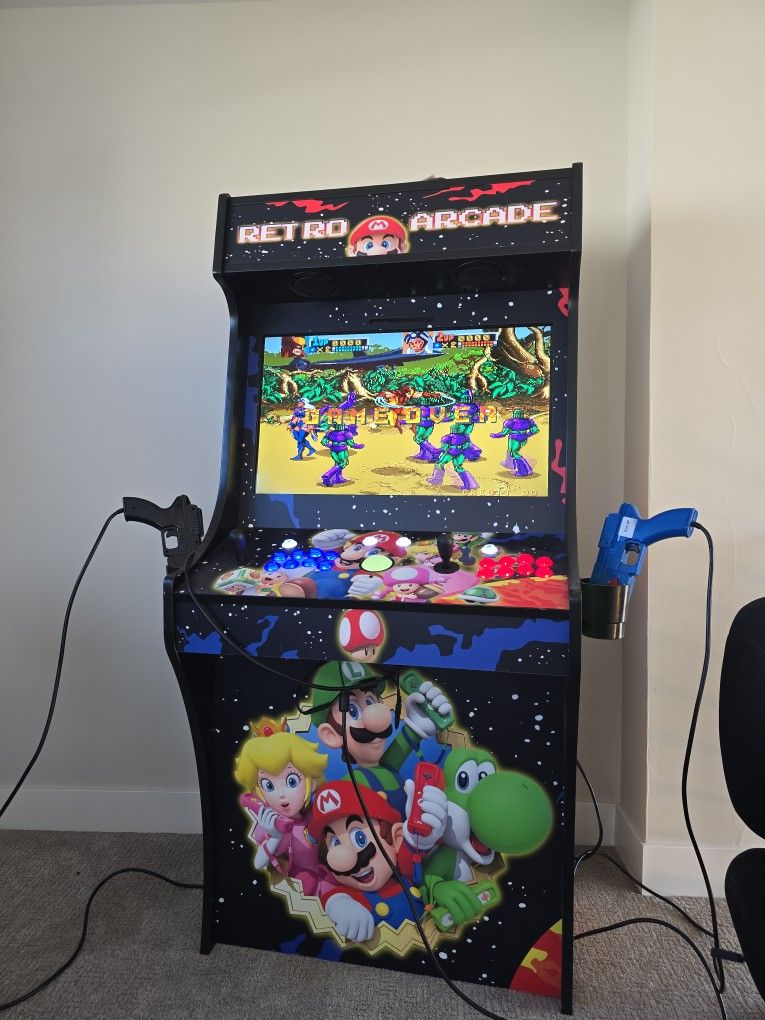 Full size 2 player arcade cabinet fully loaded with games and accessories. Professional carpentry and build sturdier than standard cabinets. Runs on a DX Special system that includes 2 fully actuated recoil light guns. You get the same recoil from the arcade classic Time Crisis series on all light gun games. Two sets of joysticks and 6 buttons plus a 3" trackball in the center for games like Centipede or Golden Tee (every Golden Tee game ever made is included). It's not just arcade games either. Included are the near complete game libraries for classic NES, Super Nintendo (SNES), Sega Genesis, N64, PS1, Dreamcast, Nintendo DS, Gameboy (all variations). It features saving games, you can save a game, power the machine off, turn it back on, and load your previous save. It's completely turn-key, plug and play. There's a power switch hidden just out of view and it goes straight into choosing a game.