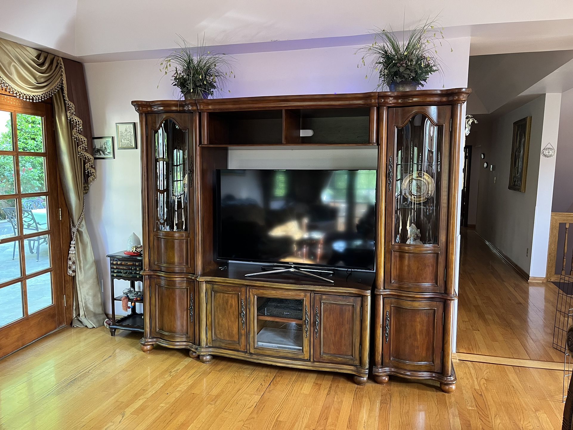 Beautiful entertainment cabinet. Have had it for years and was very well kept. Part of living room set. Great heavy wood material from years ago. Tons of storage space. TV in stand now is 56”. Can separate cabinet. Will throw in LED lights for the top accent light. Can change lights to 9 colors. Total 4 pieces. Must pick up. Trying to go asap.