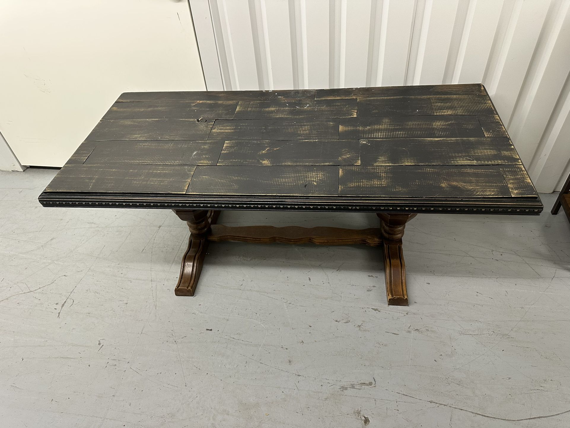 This piece is characterized by its traditional design, featuring a double pedestal base with ornate carvings and a distinctive decorative edge on the tabletop.