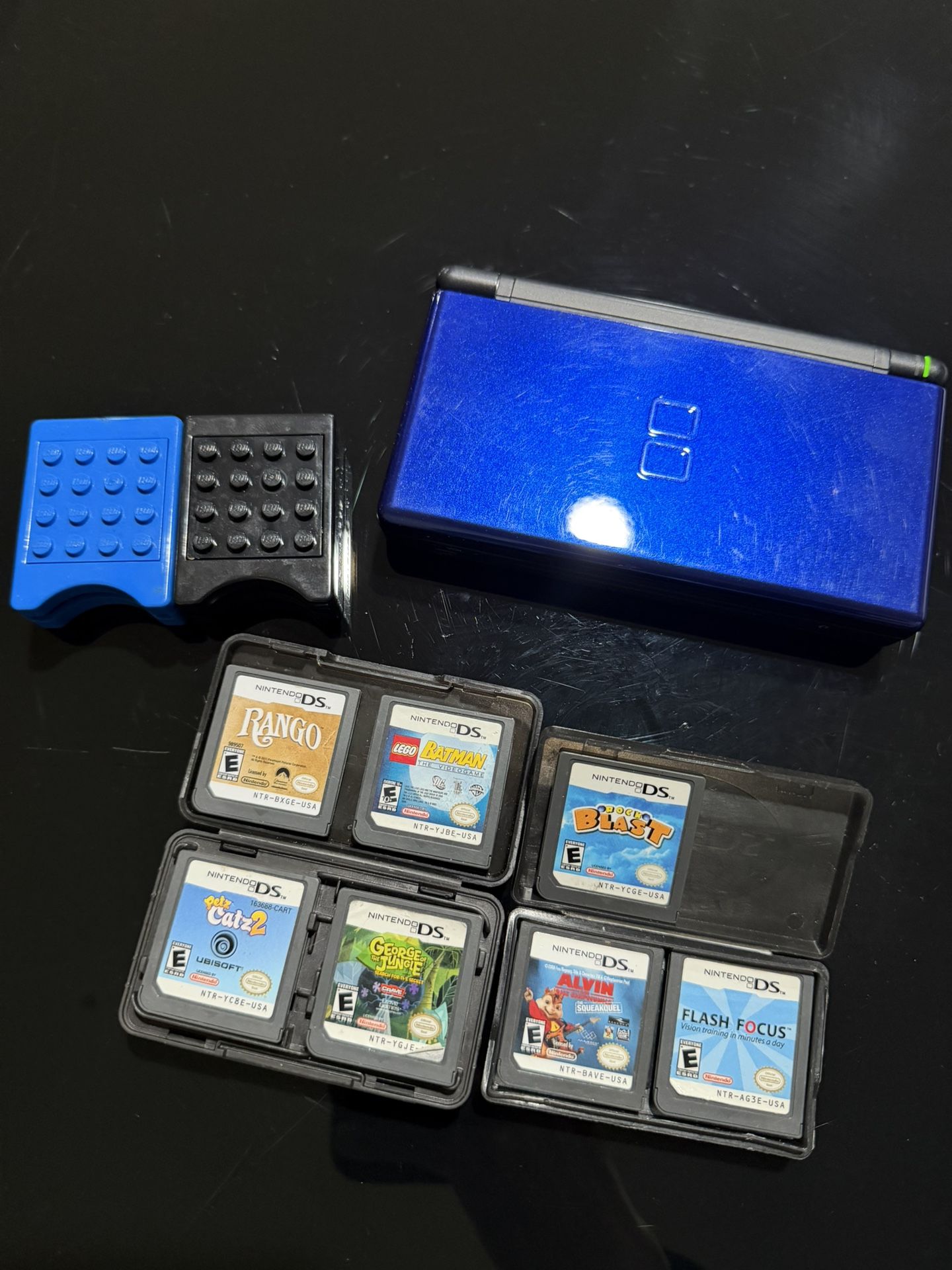 Comes with 7 games and a few cases for them, the system works perfectly fine no issues kept in good condition, and isn’t missing the game boy cover. Just what’s pictures no charger but will come charged to test out, $80 or best offer
