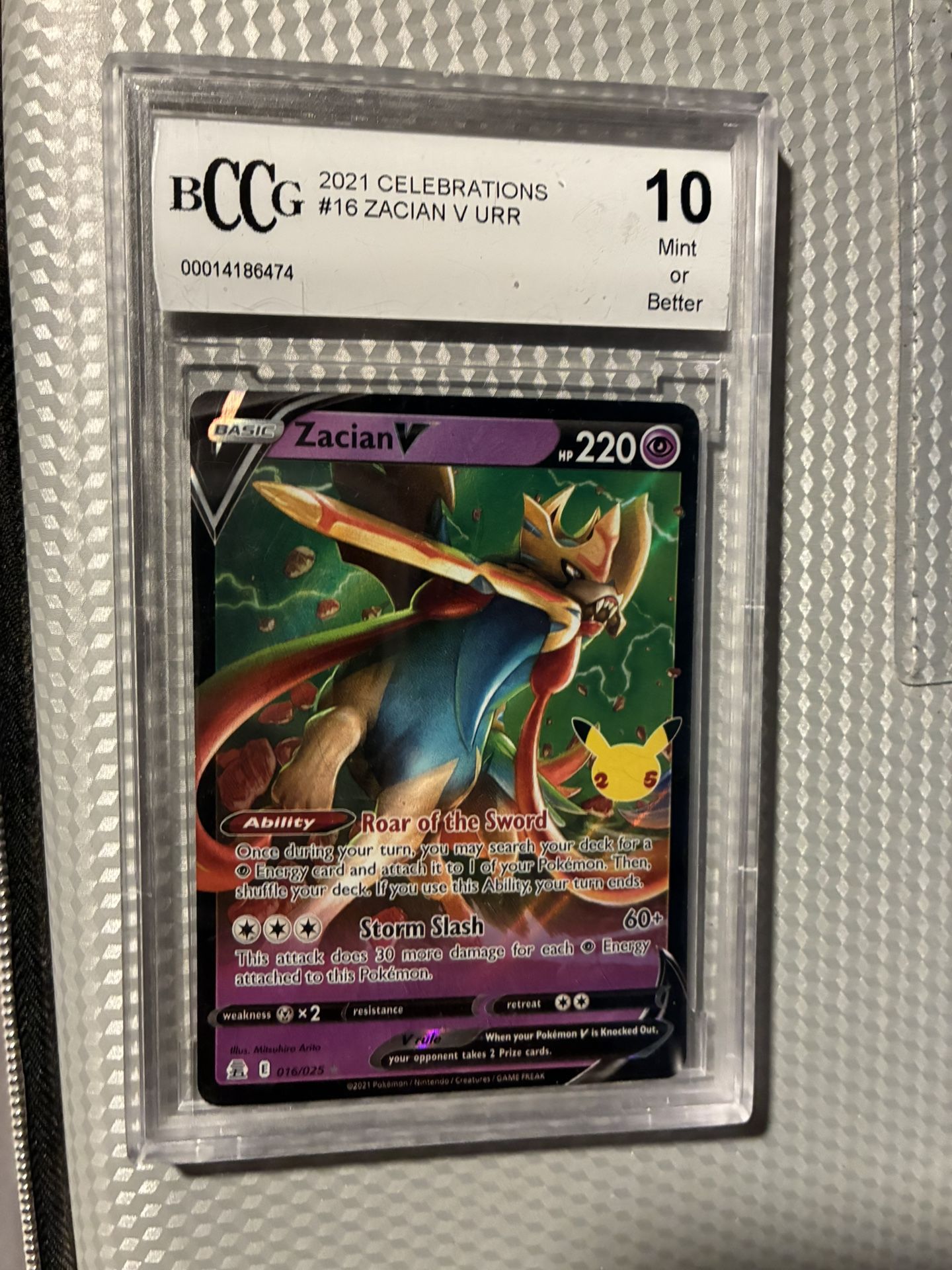 Graded 10 Mint or Better Zacian V card from 2021 Celebrations set. This collectible is encased in a BCCG protective slab. Card has purple and green artwork with holographic finish. Back of card is standard blue and white Pokemon design. Slab is clear plastic with white label at top.