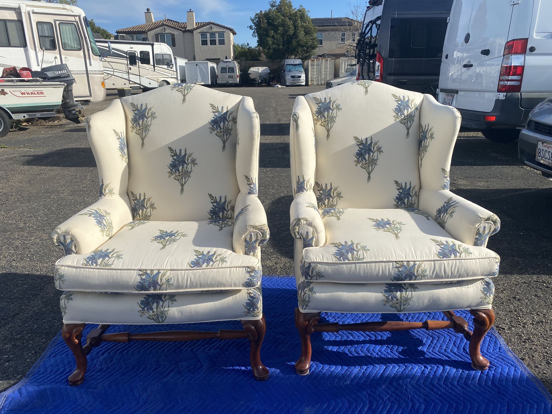 I am offering these beautiful vintage style chairs with blue flowers and green leaves. Beautiful wood finish for the legs. These chairs are in awesome condition. $40each or $80 for both.