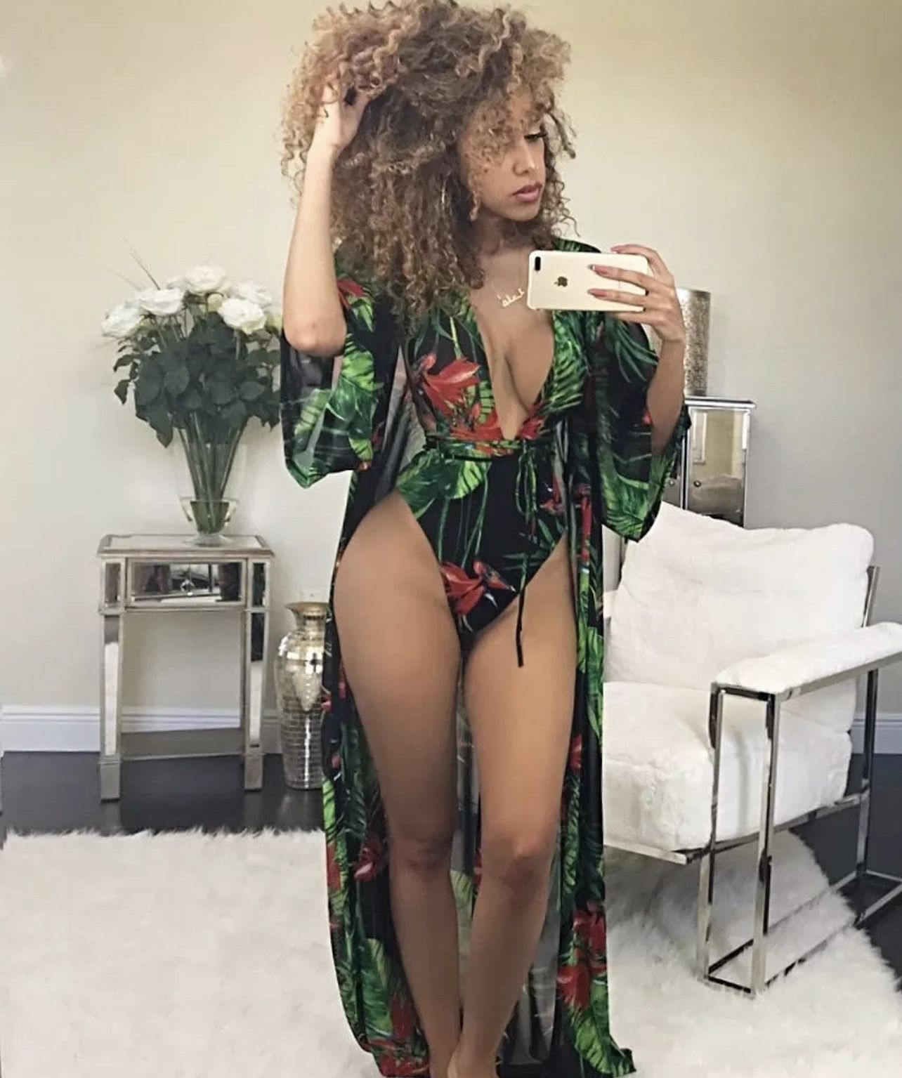 Cute tropical one piece with versatile front straps and long matching cover-up. Please inbox me for size.