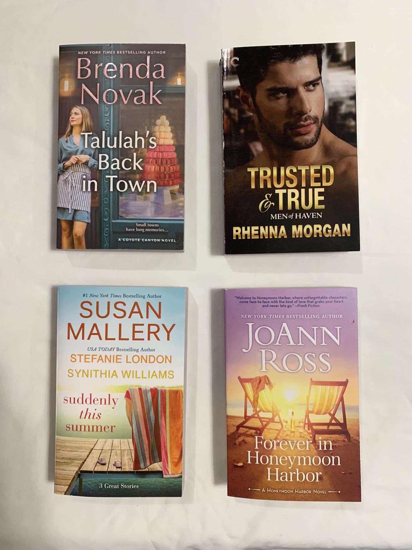 Books For Sale Brenda, Susan, Rhenna , & Joann (4) Book Total Brenda Novak “Talulah’s Back in Town” Susan Mallery “Suddenly This Summer” Rhenna Morgan “Trusted & True” Joann Ross “Forever in Honeymoon Harbor” (4) Book Total