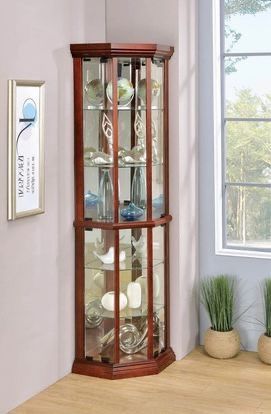 Warm, Medium Brown Finished Corner Cabinet *Clear Tempered Glass Doors *Adjustable Shelves *Mirrored Back Panels 16.5"W x 16.5"D x 72"H Best Prices in the Industry Guaranteed! *No Tax *Pickup in Tracy by Appt *We Can Deliver