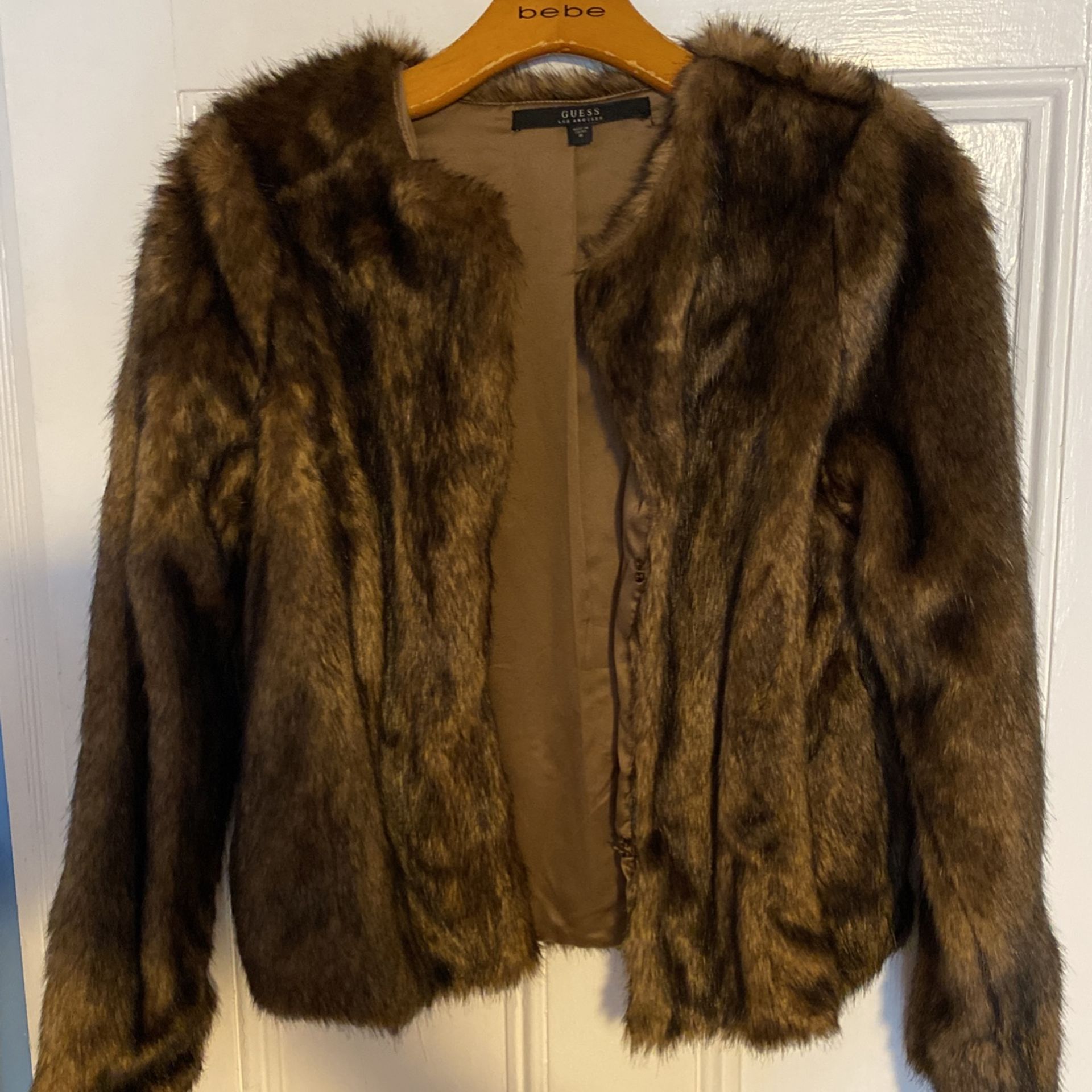 Never used with no tags,. Guess Los Angeles fur coat, brown, for women