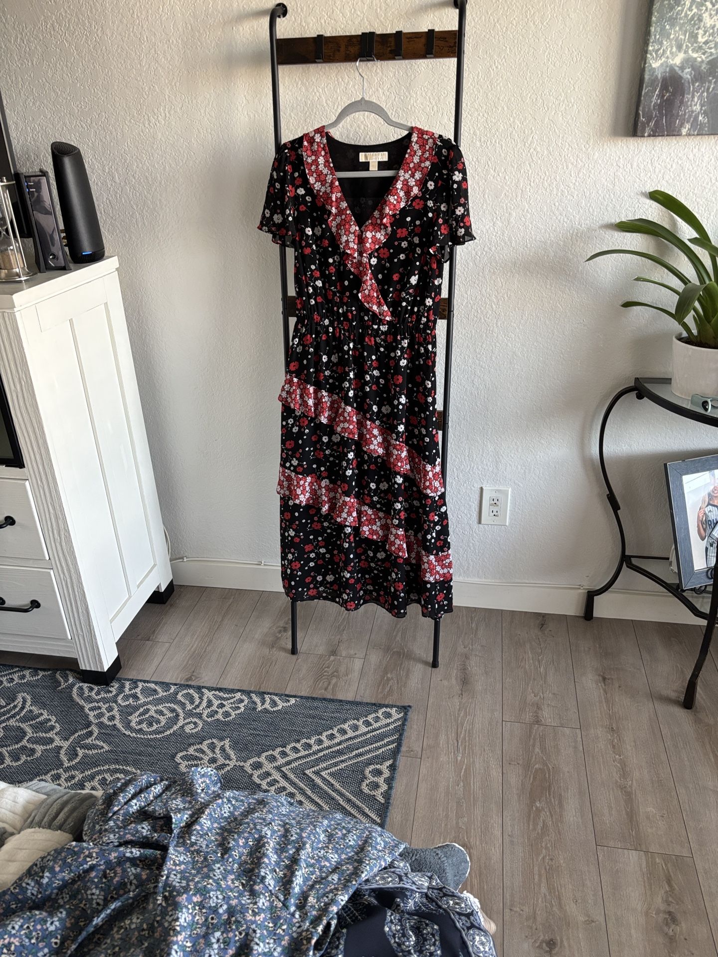 Michael Kors elegant, fashionable floral dress, black, red and white, sheer layers , fully lined , women’s size Medium Length 48” L from shoulders to waist 16” L from waist to bottom 32” Elastic waist stretches 17” Pit to pit 16.5”